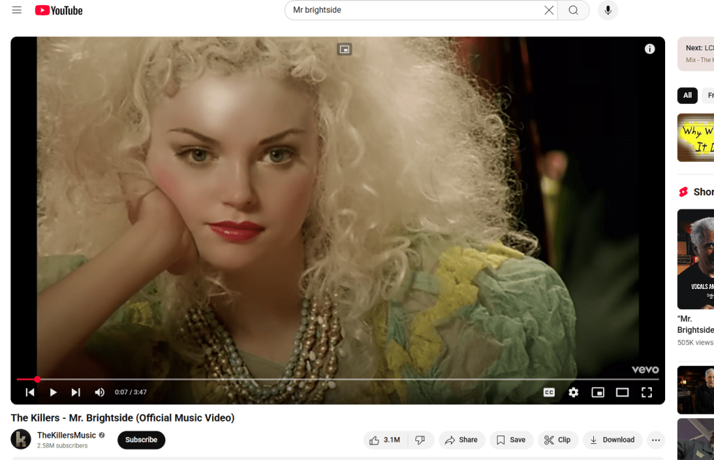 This is a frame from the video of Mr. Brightside, that I used to define the canvas colors. She is the primary focus in the video.