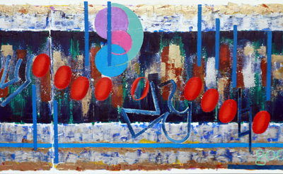 Everyone who has been in the studio has been happily surprised by this canvas, which has been a surprise. This work appears to make a good first impression. Second impressions must included, does this work balance? Helping that balance was to move all the notation up somewhat to improve the top, bottom, balance. The left to right balance is good till the far right where the upper area lacks interest other then the base. The signature will help here, but is that bad or good. The canvas is about the music but the signature is about the artist. Interestingly the signature on a number of previous works has played the roll of balancing and creating interest. There is no doubt that the size and placement of the signature has been considered an important part of these works, so although the main focus is the music and it’s display, the signature should not be under estimated. Simply put, walking into a room and seeing this canvas on the far wall, anyone who has seen this artist works will know, no matter the work, who the artist is. That would be confirmed by the prominent signature. The signing has always been important to this artist, and now it is a part of the music..