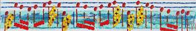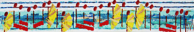 Vivaldi  Four Seasons Spring Allegro, 2 panels 12 inches by 6 feet. What can be said is that this is a dinky 400 pixel picture for a small, by the standards, work of art, so detail is lacking.  This final, final version brought balance to the 5 eighth notes (those yellow things).   Enough disorder was left for them to counter nicely with the beams (those red rectangular boxy statements)  that hold eighth and sixteenth notes.