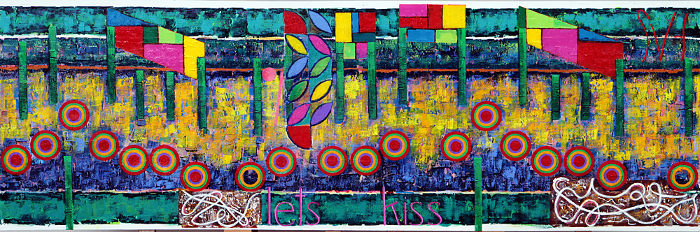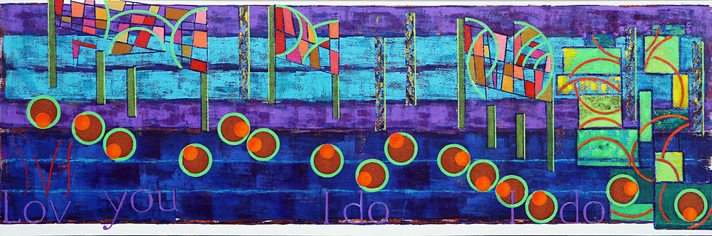 Some words about the words to this artwork, which are Luv you I do I do. They are this artist interpretation of the musical phrase, “Loving you the way that I do There’s nothing I can do about it.” The decision to paint a musical piece depends on these major things: How much does the music effect me. For example can it be played over and over again, throughout the three or four weeks it will take to finish the work, and still sound fresh and meaningful? Is there a musical phrase part of this music that has great interest and great opportunities to experiment with? If there is a phrase that might work, and it contains words, can those words be twisted to then become an expression of this artist. And last, will the music fit on the available canvases.? Actually, the first and biggest challenge is to go through the list of must paint music, and then convince all over again just why this music should be painted. Some times it takes days, and no, no matter how practical it might seem, it is impossible to switch this artist mindset. In other words, if the current painting is More, there is no room for any other thoughts concerning the next work, which is now to be Heart.