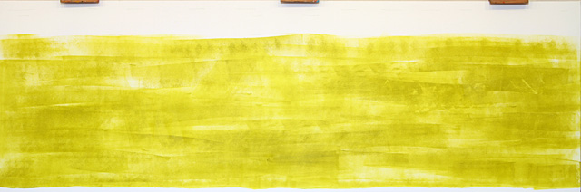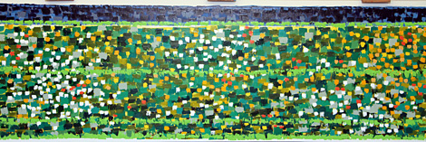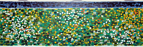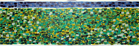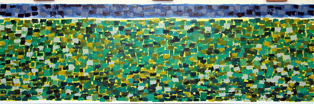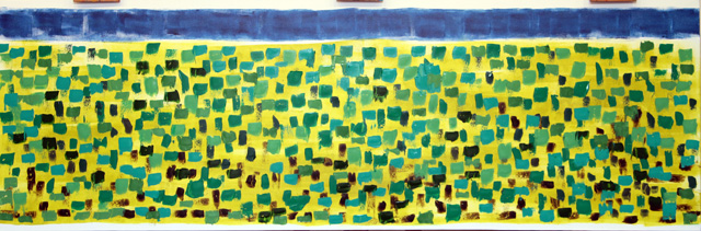 12:01am Listening to The Finer Things sung by Steve Winwood. A very favorite back, and one of the first musical DVDs that I purchased. I believe the basic background on the lower green section is done. The fan is drying the paint and I would like to begin to add the dabs of white and strokes of a couple of different yellows and a little orange. There will be more to smooth out the background. It is kinda of lumpy in spots. Added some Anthraquinone Blue to the very top edge to begin closing that off. The dark edges along the top and bottom push the artwork inward, and help to unify the work. Listening to Unpredictable sung by Jamie Foxx and Ludacris.