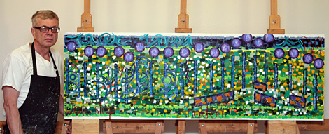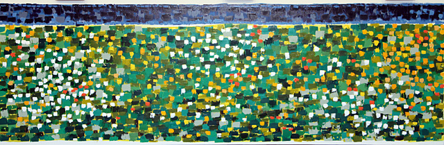 Post Comments: It would have been better if the final picture included a smile, but exhaustion and the over whelming feeling of lets get this done,clean of this mess, and get back to Vivaldi stole the moment . The main take-a-way is that this work was too much to try to accomplish in one day. In the end the ideas ran out, the creativity dropped, and the only motivation left was to apply enough paint to finish the work. Still, for a work that did show some new creativity it does stand quit well on its own. Every color that could be thrown at this canvas, especially greens, was tried. In fact at the end there was a sense of desperation to search for a color that could help to kick up the look of the beams. What was a surprising was stumbling into Gold Ochre that did just that, and ended up being the final color.