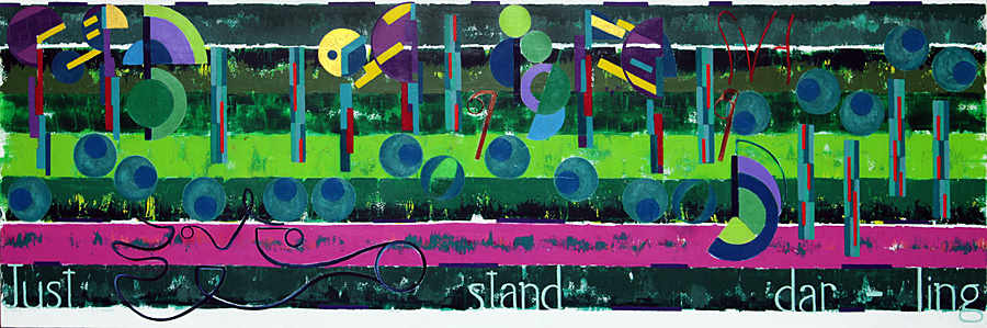 How would this painting rate, with its rival Hallelujah, and with this artist progress?  The darkness of Hallelujah’s background and the power of blue is hard to criticize, and could have been used with Thunder, but that seemed redundant.  The strength of the violet strip in the middle of Thunder does give it a snap that the Hallelujah lacks.  Thunders eight notes are a lot more intricate in design and colors, but it is not sure that is better then the simpler , and maybe stronger, Hallelujah. The more complicated colors relationships, and shapes use in Thunder, does add considerable more interest.  The notes themselves in Thunder spin across the canvas and are more interesting then the dimmer and basic design used in Hallelujah.  Hallelujah’s word is stronger but its thickness did not seem appropriate in Thunder. Also, more important in Thunder, was that its words blend more with the whole canvases muted color theme.