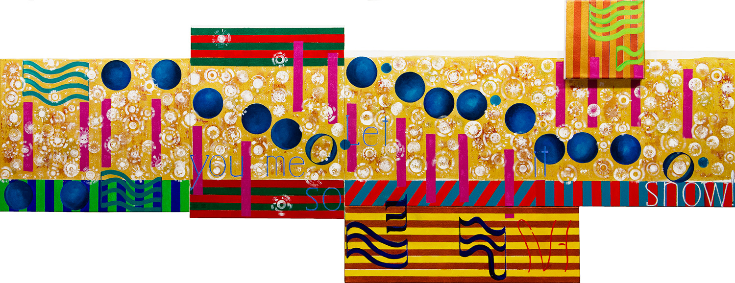 Let it Snow 2012’s Christmas painting.  This artwork consists of five panels with a length of 76 inches (1.93m) by a max height of 28.75 inches. What came to mind when I was rushing to get this work completed, was that this Christmas work represents the style of 2012.  When I look back at the earlier years Christmas works I see a lot of changes have occur between the years.  That is something you do not see in the Birthday paintings.  Those are also unique works, but because of the time constraints I tend to take the style path of least resistance. But with the Christmas painting I have the time to show what I have learned for the year, and it shows with each years work.
