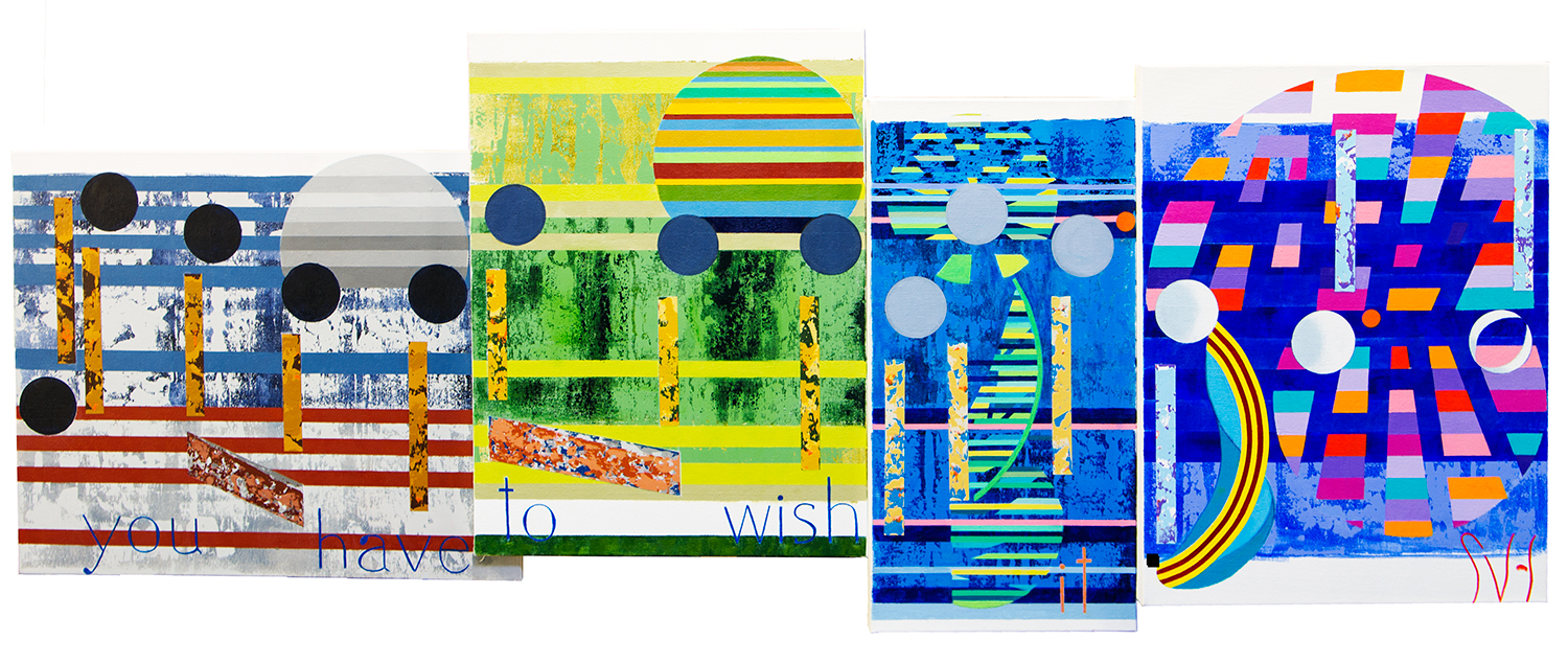 The base colors are dark and gritty, to keep with the mood of the music. This changes as the work moves from left to right. The third canvas elevates about the first two, while the fourth canvas is another step up from the third  This artwork is another three-layered work, similar to The Four Seasons Work, Spring Danza, where you have to go to the firth canvas which is the first to touch the wall in my living room.