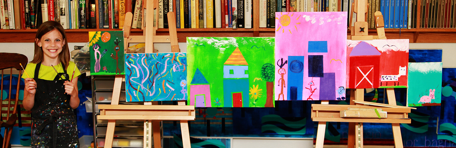 This is Jordyn’s final image. This was a three-day project that amounted to multiple hours of work each day. Her enthusiasm and concentration, I thought was outstanding for a nine-year old. Jordyn especially like the work she did on the far left panel of her favorite animal which is a pig. Her laugh was so different and so real that I knew she loved how it had turned out. Jordyn’s depiction of people is greatly influence by the works of Miro and Picasso. From left to right the panels read as follows: two people playing catch, fireworks with a person watching, houses in town, the city, the farm, and her pig. Many times I offered direction to awaken her efforts or to move this project along, but never did I make the final decision to subject matter, or choice of colors. I let her lead us through this project with my main duties being brush cleaning, paint mixer, and guide. This work came all from her, and she deserves a lot of honest praise for it has truly been earned. Jordyn’s did more the exceed my expectations. For three days and a lot of hours she let her imagination out and down it came in reds, blues, greens, yellows, an a pink pig.