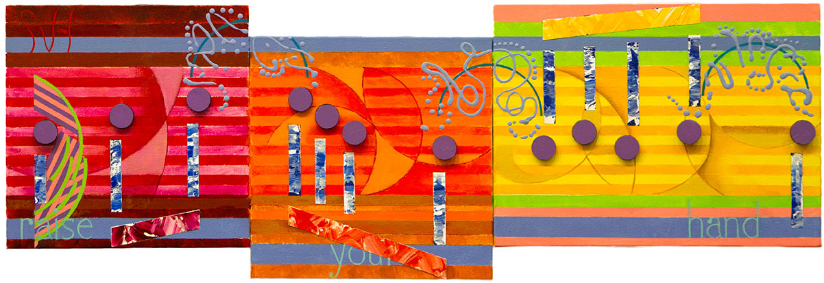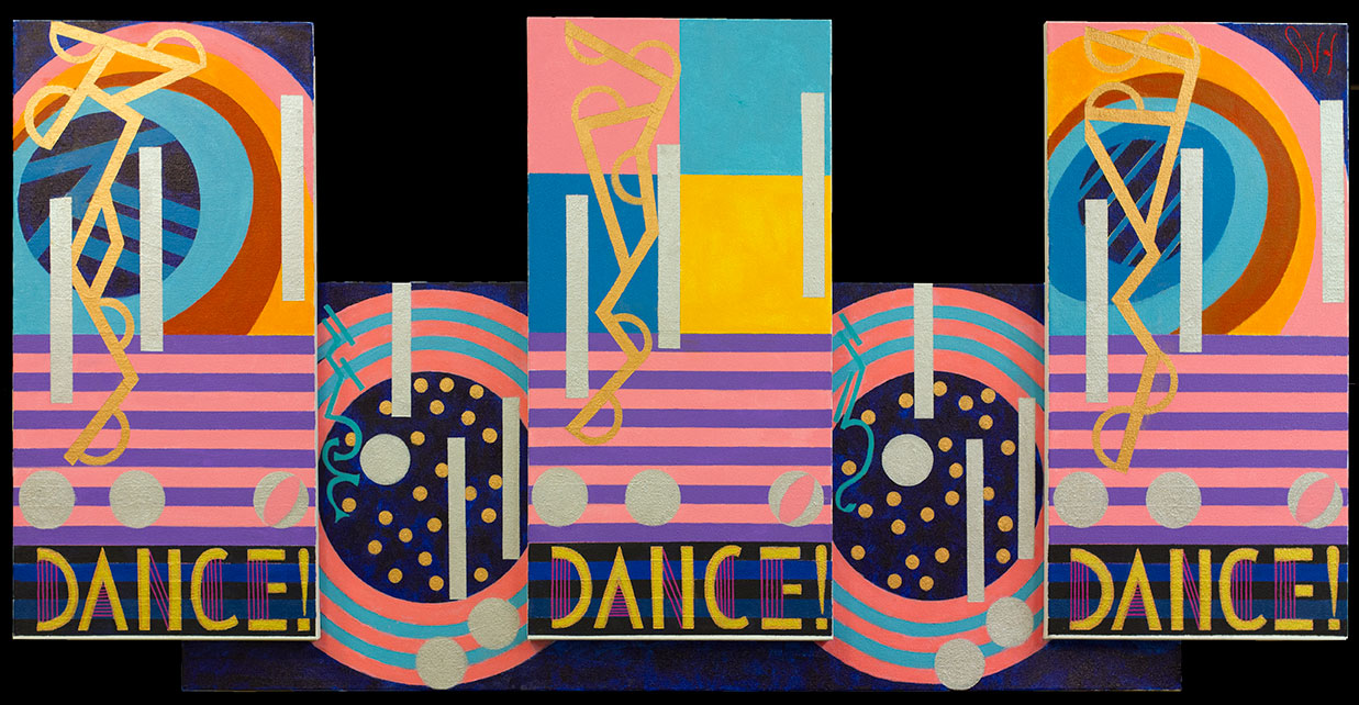 In the original plan I wanted to keep this artwork on the smaller size because of this music’s absence of drama (no slurs or ties, no flags, or beams), but my focus changed from the music to the words to at least add some interest. That changed in direction created a problem, absent if I would have used smaller canvases, of what to do with all that space between the music. After a couple of, what I would consider, tired attempts at stripping I realized I had nothing. That is when I turned to the painting, I Won’t Dance, a Jerome Kern Jazz Standard from the same time period as Embraceable you. I Won’t Dance uses Art Deco treatments to mirror the times, and I thought a similar look might work with Embraceable.