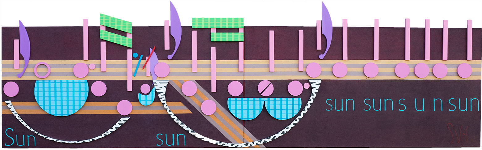 Mr. Brightside is a simple song made up of mostly quarter and eighth notes in a fairly even pitch.  This than shows in the  musical flow, and in the solid blocks of color used in the background of the artwork. Besides using the colors from the video in the painting I wanted to represent the people and the spirit of the bar.  To do this I took my two eighth notes and added to them some left over wood pieces in different shapes and colors. I know that is not much, but that was all I had left after three months of working in a toy room.