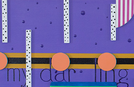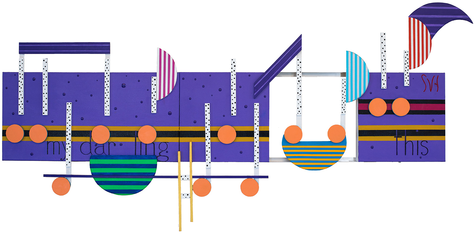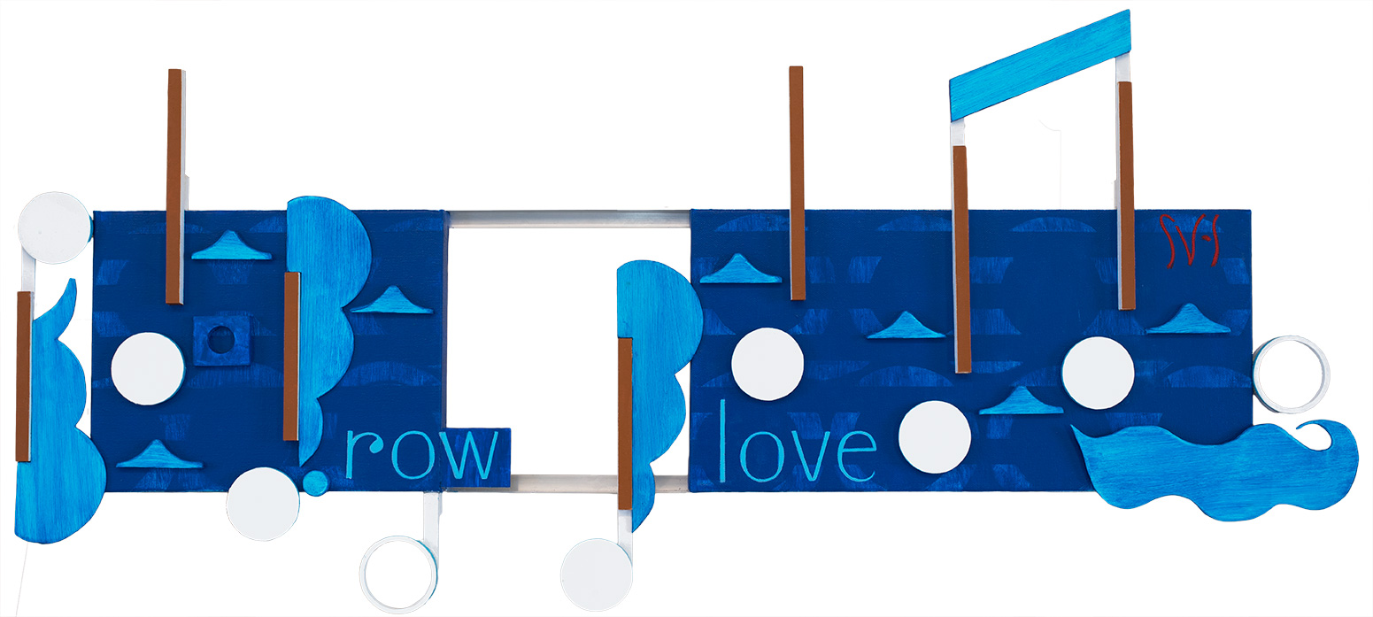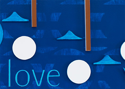 When Doves Cry 2017, acrylic paint, three canvas panels with wood and aluminum added, 52.5 inches in length by 25.75 in height.