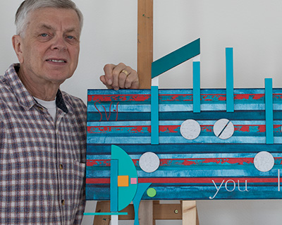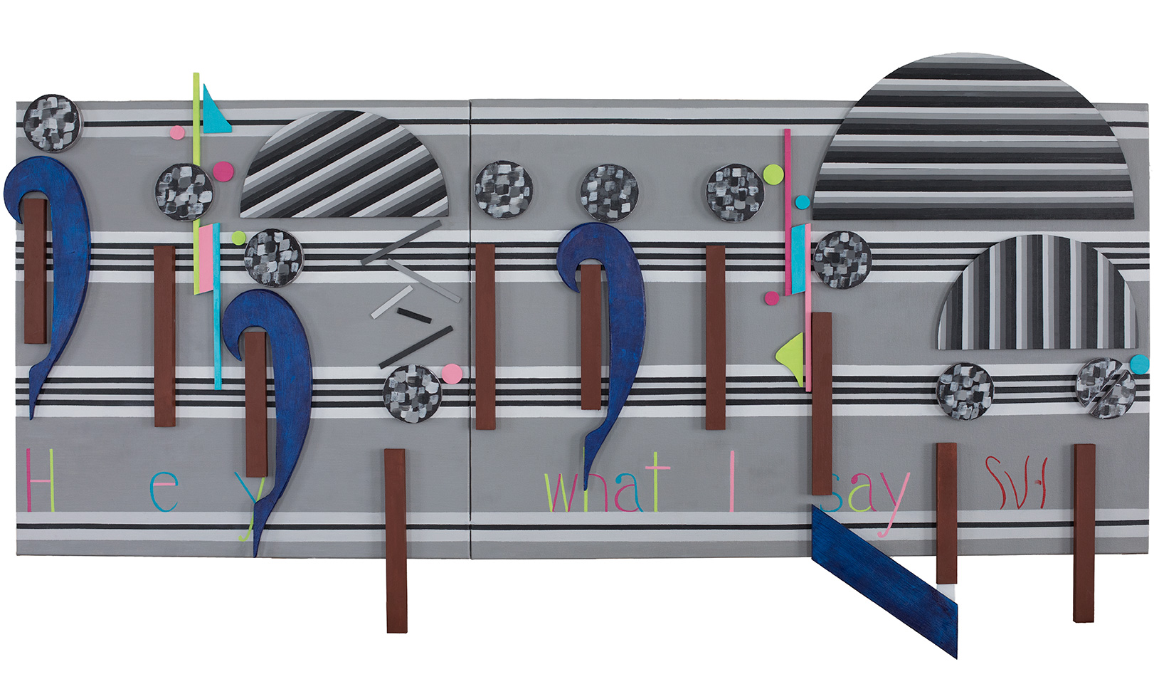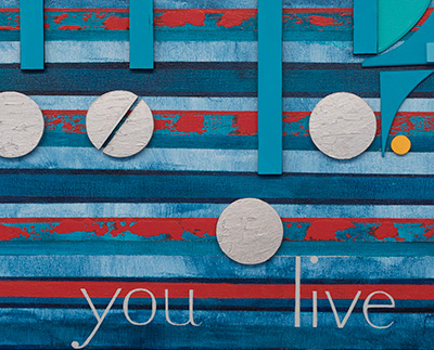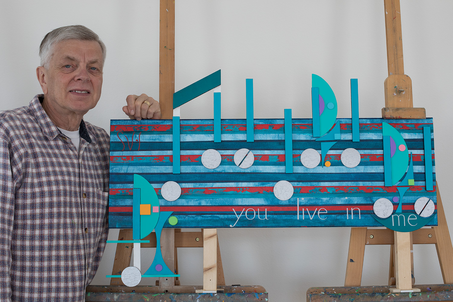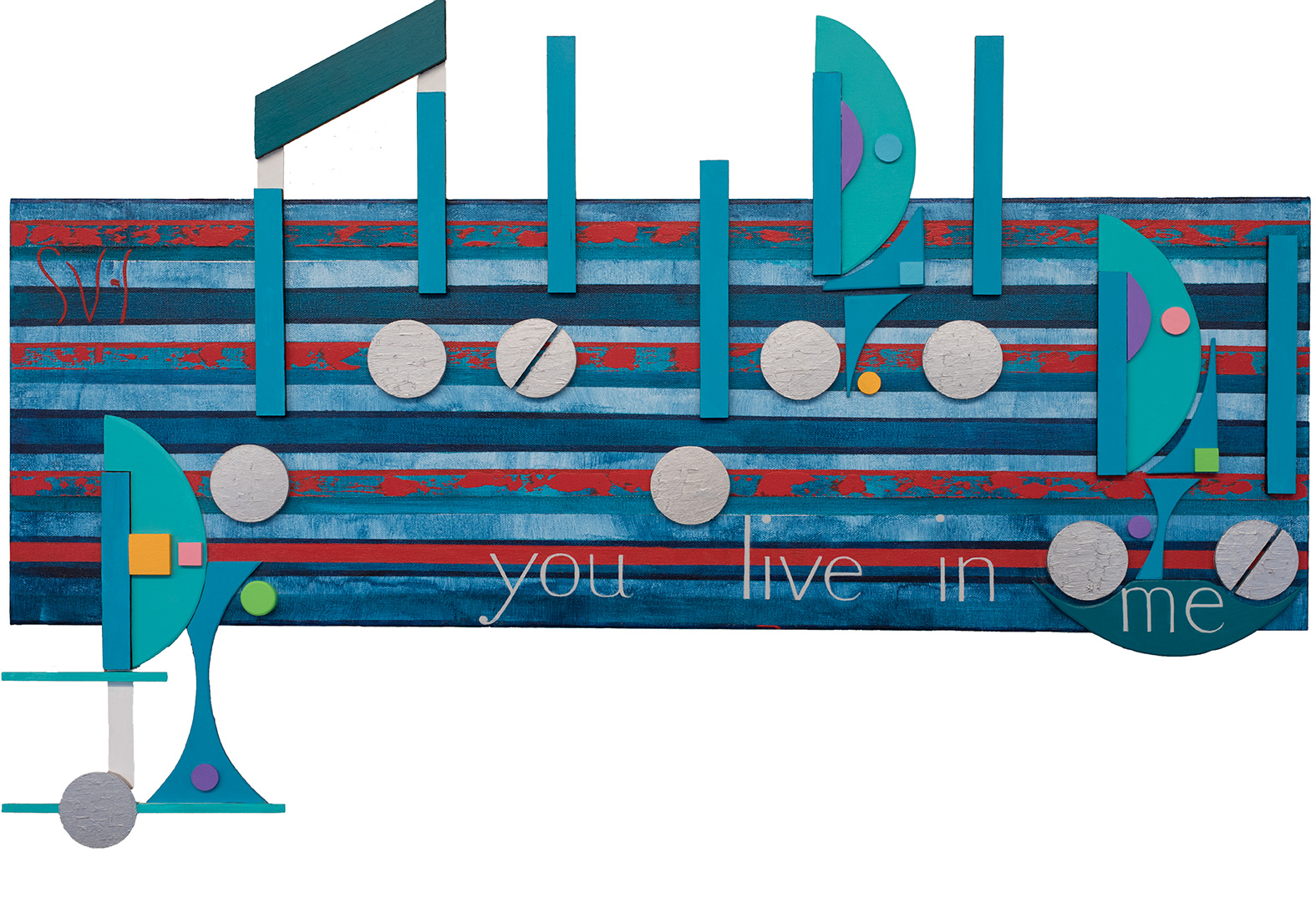 Throughout this project I have kept the color range close together, working in shades of blue, and greens. In this final image I have decided to throw in some miscellaneous colors that probably have nothing to do with the theme of this artwork.  I added these little color pieces, similar as you saw in Satisfaction,  for a number of reasons.  I like using the little odds-and-ends pieces of wood in bright colors, here-and-there on an artwork to break up the work and add some interest.  I also think of these extra wood pieces as fragments of the music flowing around the painting. When listening to music there are a lot of sounds that echo, that blend, or taper off,  and that is what these little wood add-on pieces are there to represent.  It all adds up to making an artwork fun to look at.
