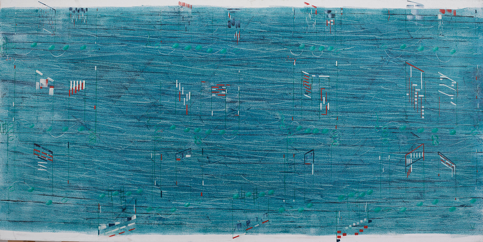 I have to comment on two aspects of this artwork. The blue you see above the canvases represent the sky. The lighter blue rectangles represent clouds. The brighter greens and browns you see below the canvasses represent different layers of the earth.