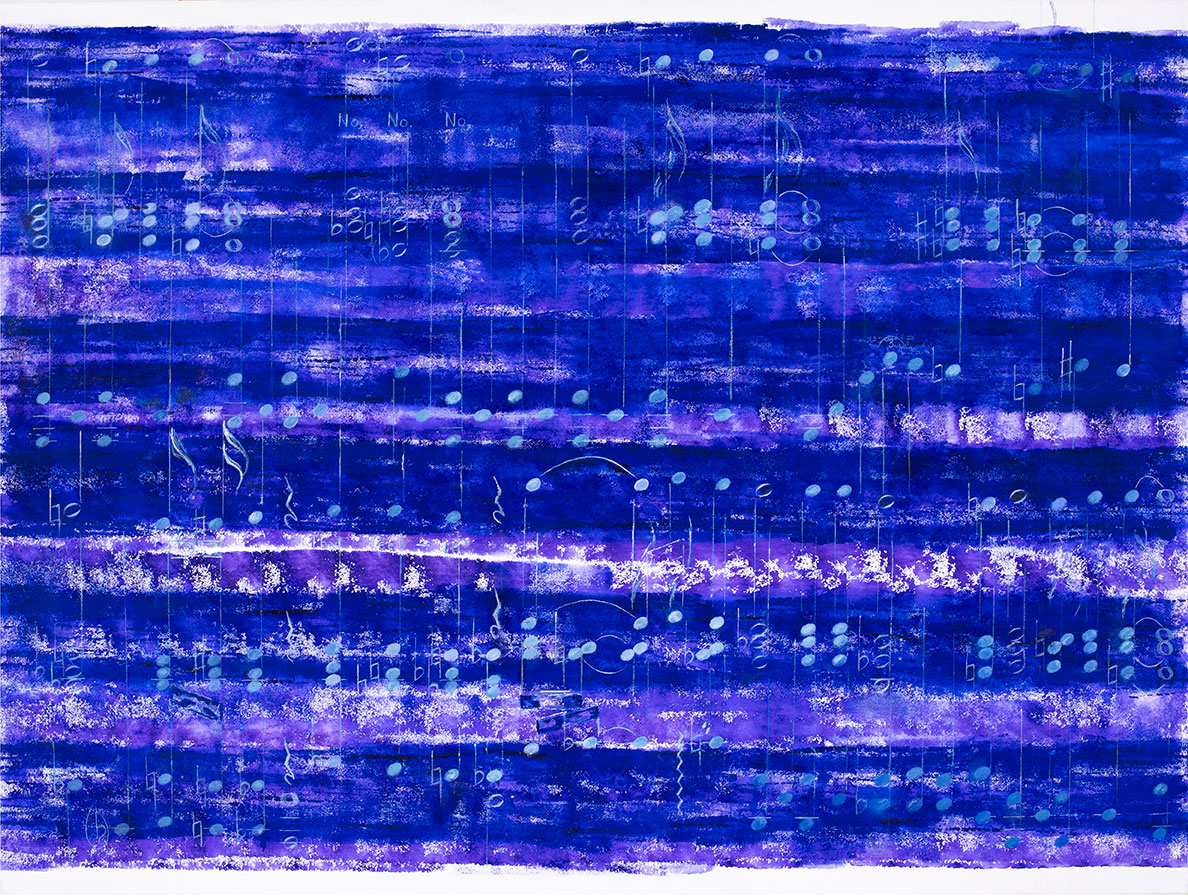The words you see in this work, “God knows you,” come from the music’s lyric, “God only knows what I’d be without you.” What you see in these two sentences, are some shared words with different meanings. My need, for any words that I use, is that together they do not refer directly to the music. I always Google down three pages to confirm that there is no connection. I actually like working with the words in this way. These artworks go beyond the music that they start with, in direction and meaning. They also have greater depth than any abstract image of the music. As mention in many blog entries before, these artworks are a portrait of an individual piece of music. They represent a musical piece uniqueness and character.