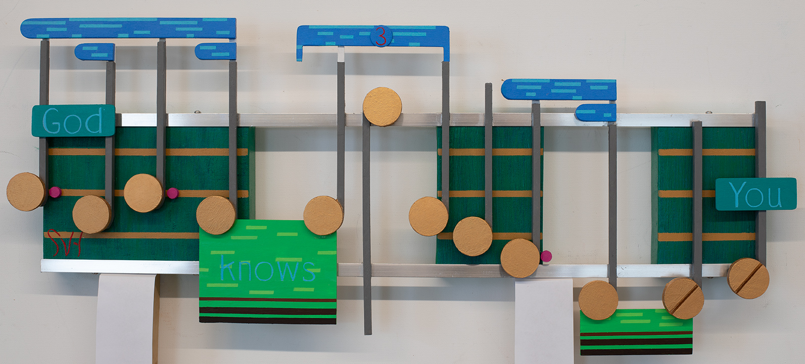 Finally, I do not think I have ever used the word “God,” in any of my artworks. For this music it made sense. My lovely wife, Barb, pointed out that the word ‘knows’ was harder to read than the other two words. Like all my earlier artworks I have always used one color for all the lettering. This became a contrast issue after coloring in of the word ‘God,’ on a darker blue-green background, and then using the same light blue for the word ‘knows’ that is on a lighter green background. But, when I than tried a darker color for the word ‘knows’, that made that word too prominent for its use. My solution was to use the same light blue for all the words. This than allowed the important words “God and You’ stand out while the lighter looking word ‘knows’ to still connect the phrase. A result, in doing the words this way, is that people will first see the capitalized words ‘God’ and ‘You, and then be presented with the choice to read, or not, the softer looking in between word ‘knows.’ All this adds complexity, and challenge for the viewer to define their own meaning of this artwork and the music it is portraying.