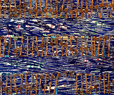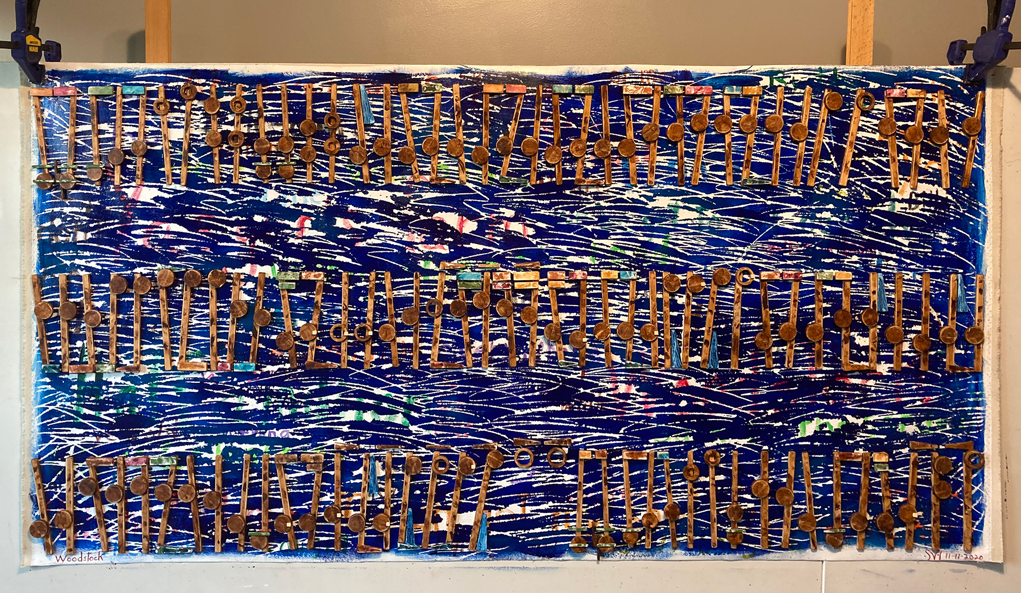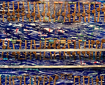 Sampling defined by Wikipedia is “…. the reuse of a portion (or sample) of a sound recording in another recording.” In Please Come home for Christmas, I am displaying samples of the musical arrangement in two lines across a three-foot canvas. I took the words from each sample of the arrangement and painted them where I planned to attach each wooden sample. I then painted the other words from the music in no particular plan or arrangement to liven up the interest and for their connection to the music.