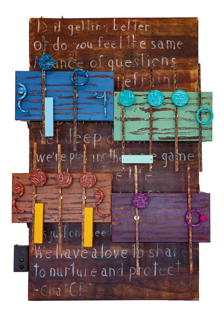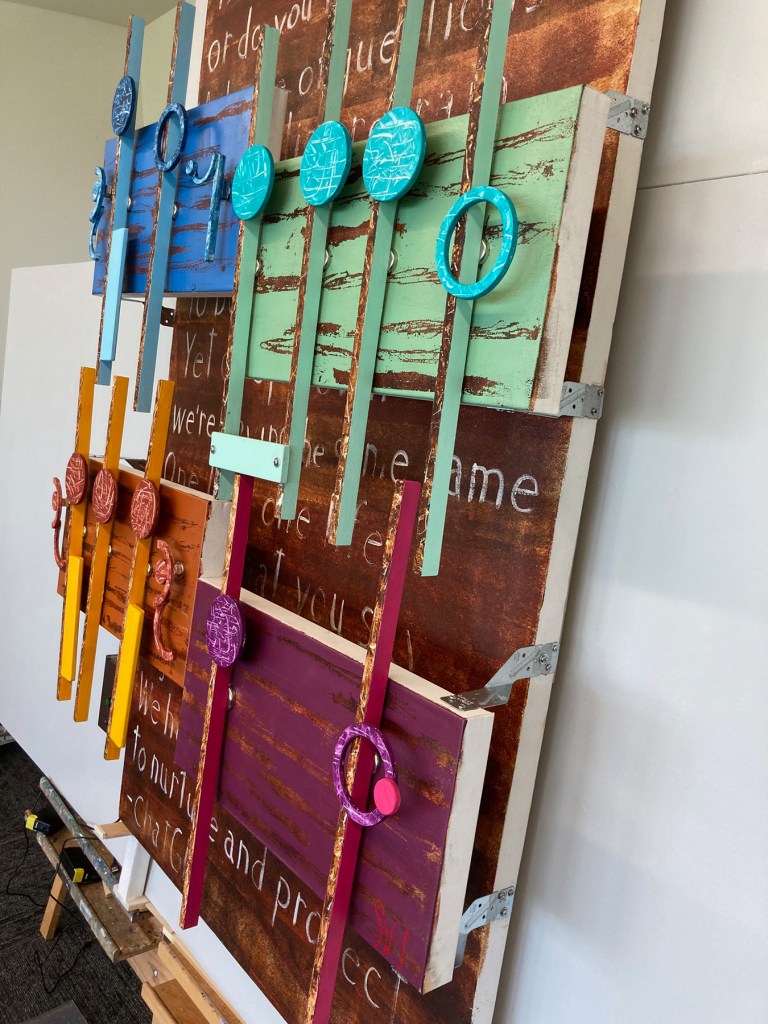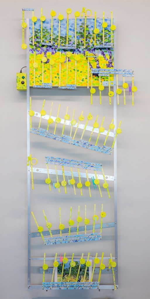 I started this project on May 9th. It feels a lot longer than that. Maybe it’s a summer thing, but I was not in the mood to do a major work. That is why the stereo system for this work is only the simple 2 watt system. I also choose to portray a small, simple part of the music for this artwork. I mentioned in the video that the music is covered based on the original version of this music. Although, what I choose to portray is my version of the notation from their 2023 album Songs of Surrender. The line I chose for the artwork is: “One life with each other sisters brothers.” The artwork depicts my notation rules that make for a condensed version of music, unlike the strict rules of sheet music.