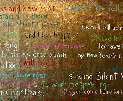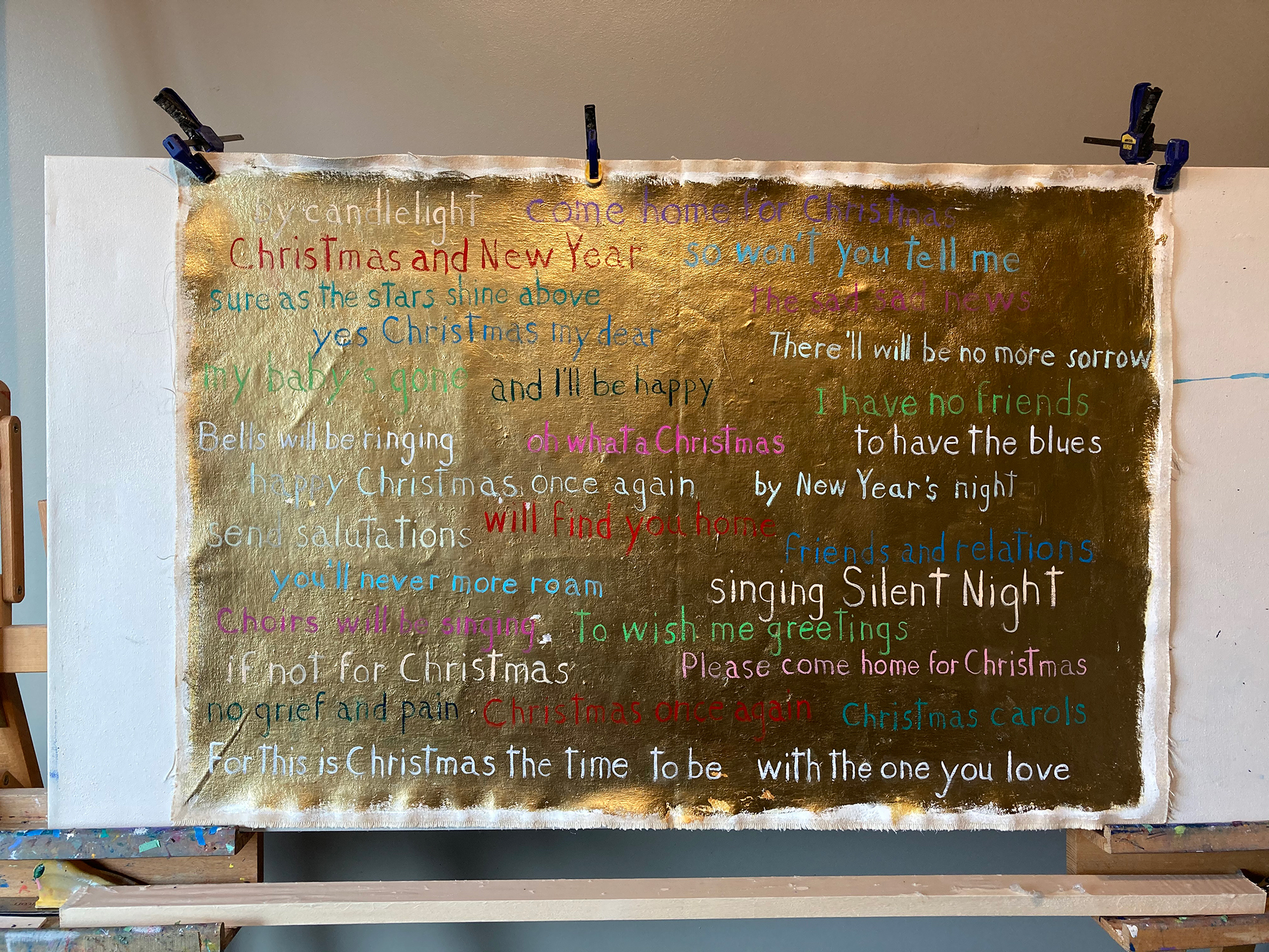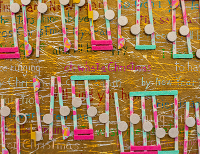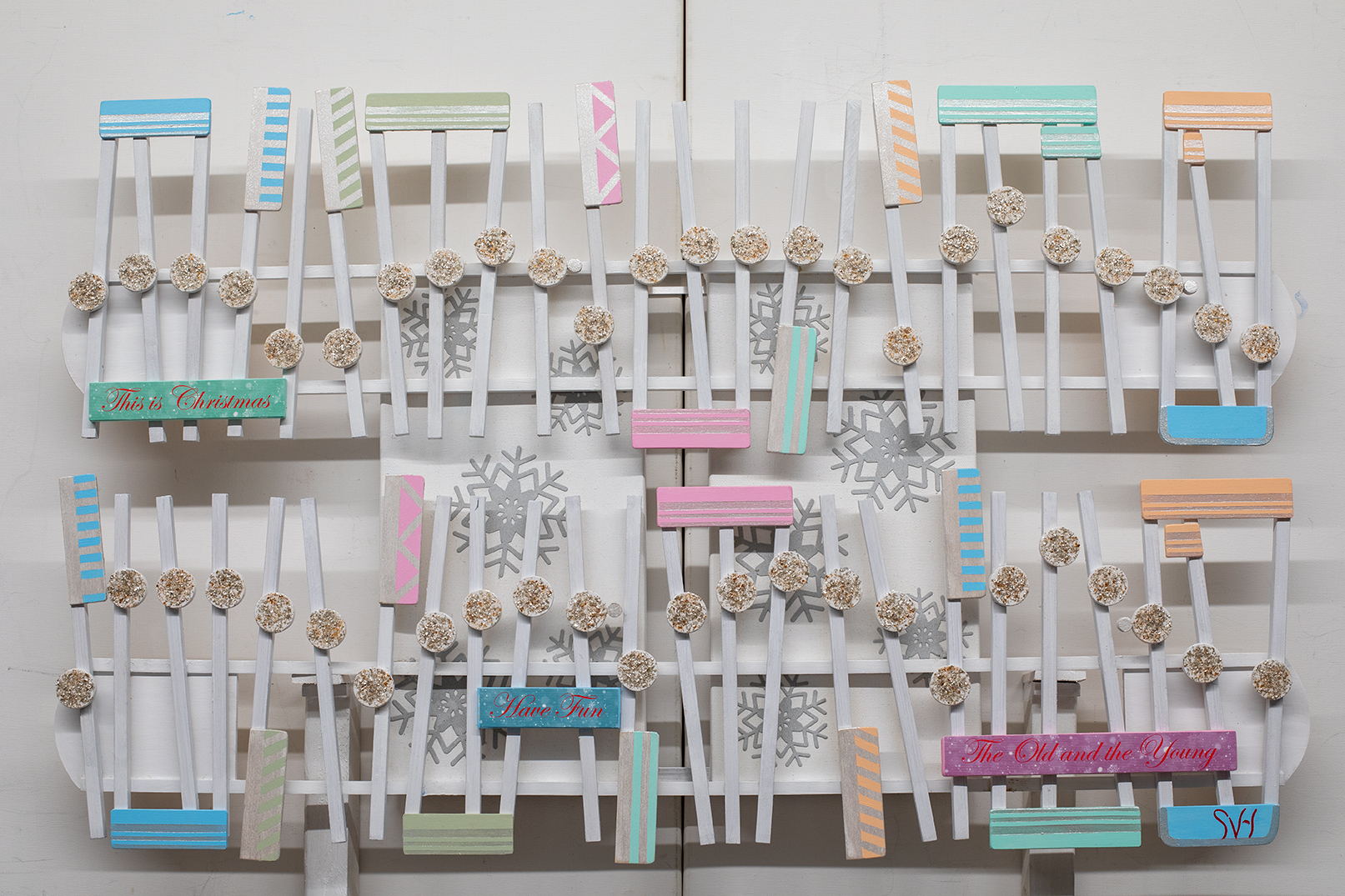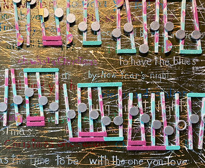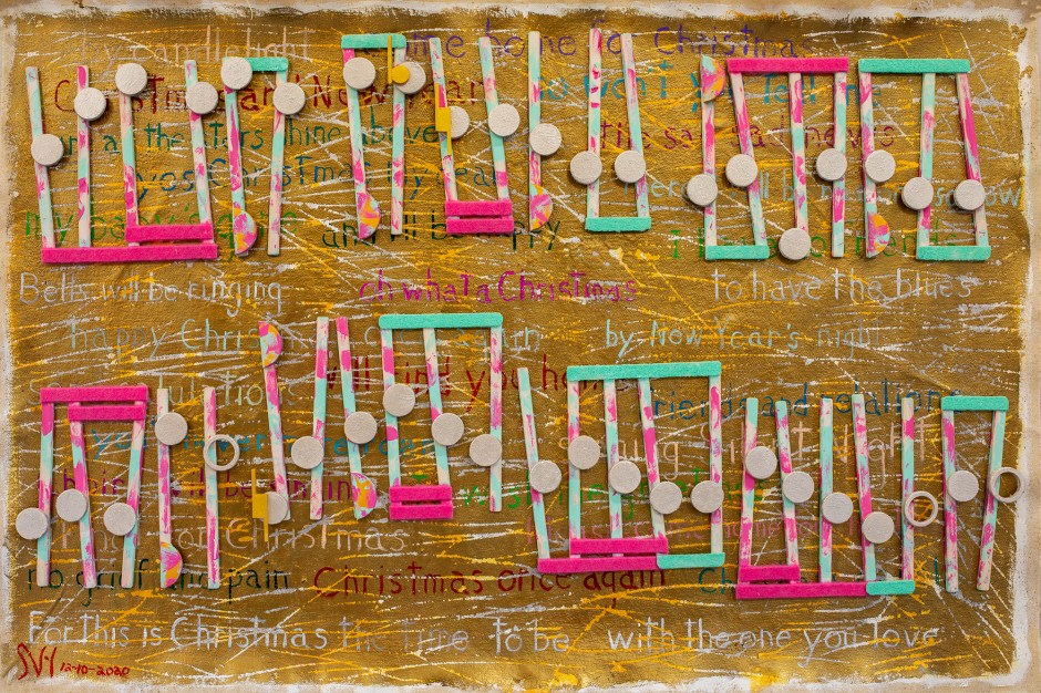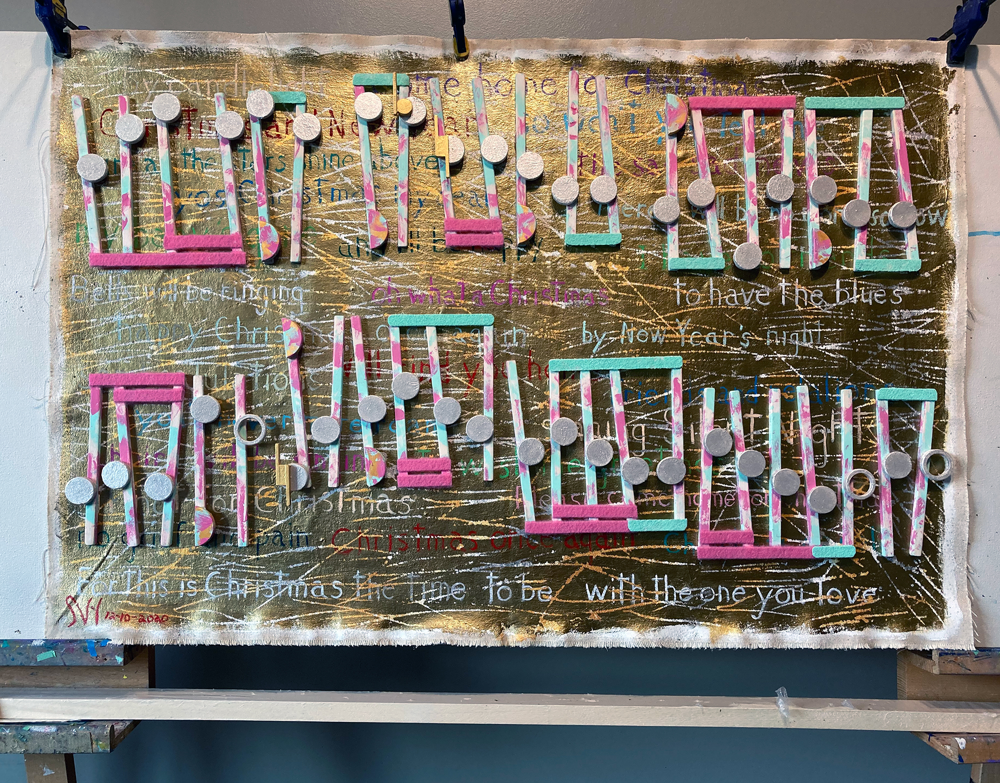 Sampling defined by Wikipedia is “…. the reuse of a portion (or sample) of a sound recording in another recording.” In Please Come home for Christmas, I am displaying samples of the musical arrangement in two lines across a three-foot canvas. I took the words from each sample of the arrangement and painted them where I planned to attach each wooden sample. I then painted the other words from the music in no particular plan or arrangement to liven up the interest and for their connection to the music.
