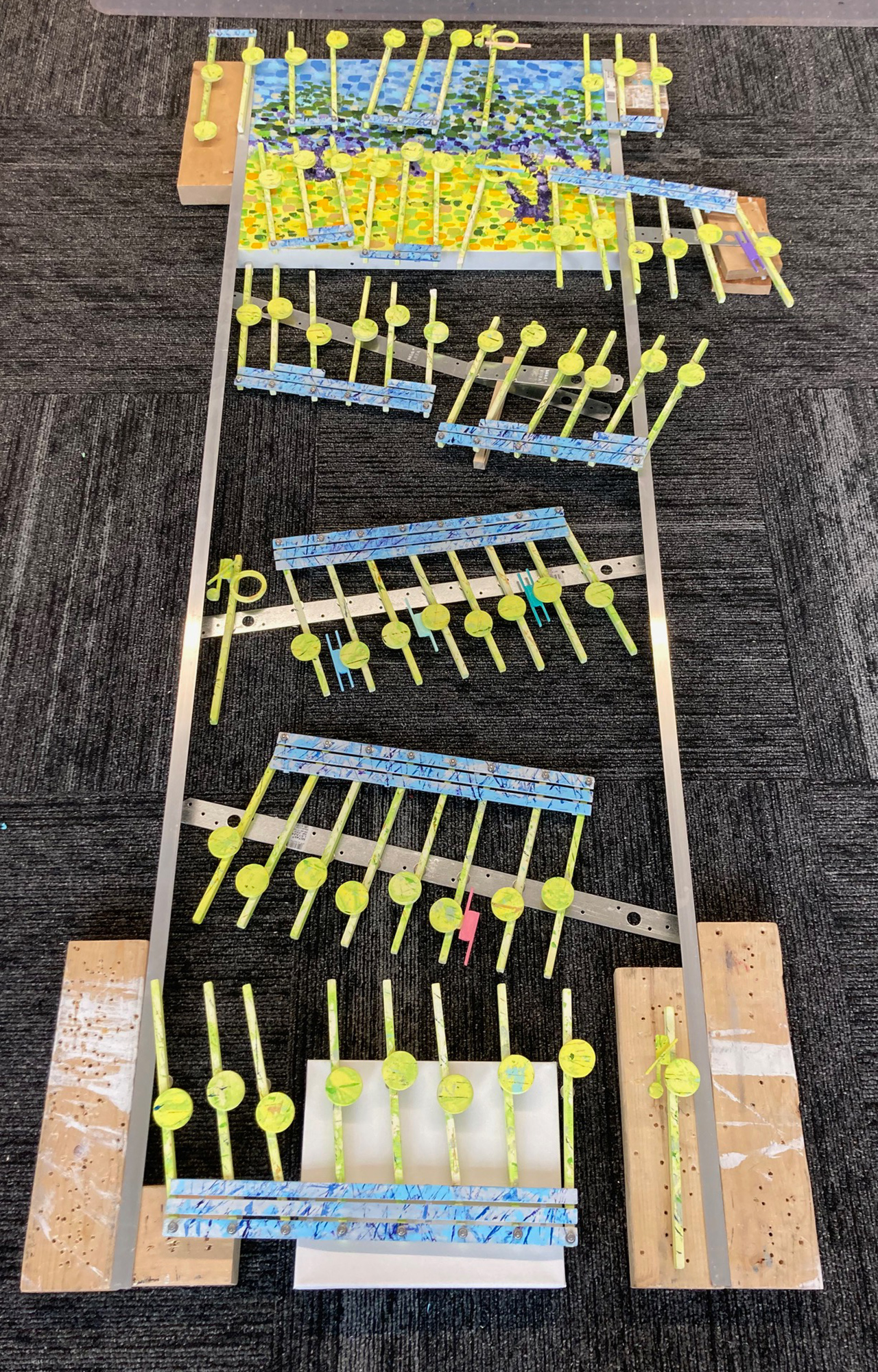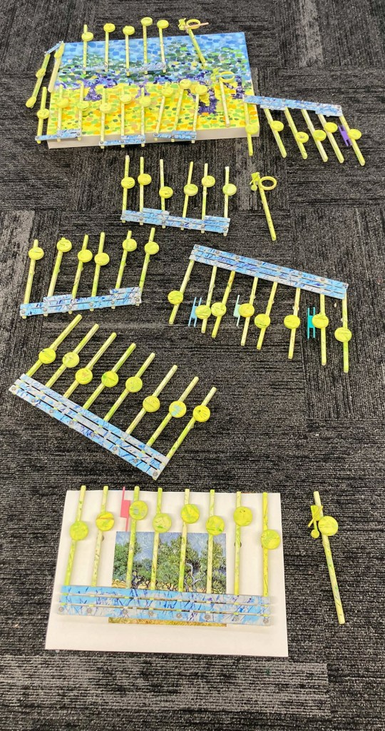 This image of the Bach project shows it sprawling out on the studio floor. At the top is the 16×24 inch canvas with a pallet painting after Van Gogh. This canvas will be hung on the wall. The rest of the music that drops off that canvas will then zig-zag its way down to the floor, to my canvas print of Van Gogh’s Olive Grove 1889 from the Kroller-Muller Museum in the Netherlands.