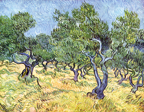 My canvas print of a public image of Van Gogh’s Olive Grove 1889 that appears bright and cheerful.
