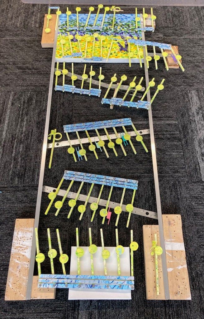 Every idea for a new project starts out fuzzy and optimistic that all problems, all issues, and all hurdles will eventually be resolved. That reasoning works for I will, as I have always done, complete what I started. My biggest issue with zig-zagging the music down from the top canvas was how to support it or not, and would that work? The final decision became I needed to support my falling notes. That is where the angled aluminum comes in.