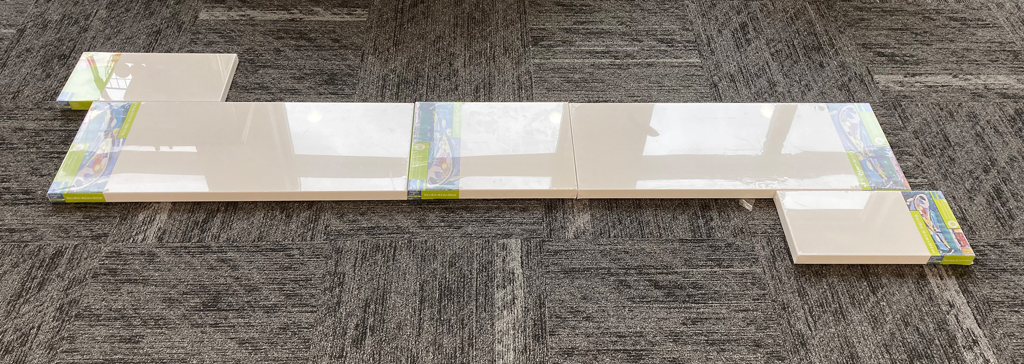I did not show in the preparatory image above, but I will set the two speaker boxes on top and in front of the main canvases. This design accommodates the depth needed for the speaker boxes. This method I used in the Beethoven project to allow the main canvases to hang closer to the wall when hung.