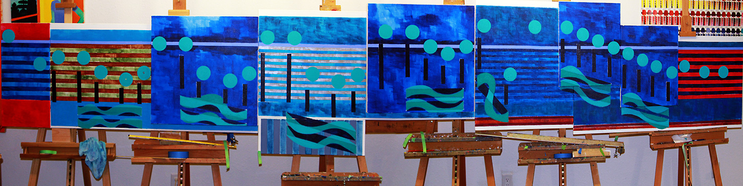 Antonio Vivaldi’s The Four Seasons Winter – Largo. This work not has 10 panels and is just over 15 feet in length.  What I did find interesting about the progress of this work, is the idea that each panel can have a unique style.  Of course all the panels do work together, which is important in that they support the musical theme which flows across the entire work. The beams in the past appeared as simple rectangles with patterns of colors, or as pieces from a rectangle scattered about, or even left out of the picture.  In this work they are now being portrayed in a far more interesting way.