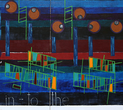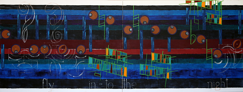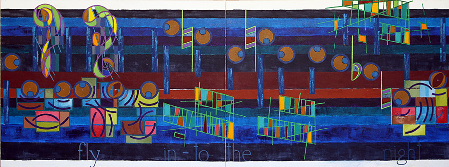 This artwork is an improvisation of the song The Pretender, written and sung by Jackson Browne. There where a number of great phrases, from this music, that would have each required larger canvases, but one small part of this music was found that would work on a 5 feet canvas.