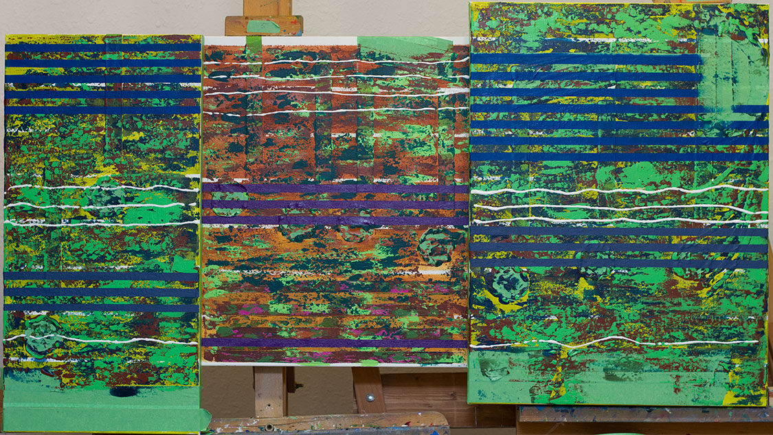 theGhostOfTomJoad_4Of course this is The Ghost of Tom Joad after removing tape. I have tried this experiment  before but not to this extent. I do not think I will do it this way in the future.  I am thinking differently about how this should be done. Next time I will just indicate the general areas where the music flow will land, and then pull the layers of paint across these areas with more care.  By doing this l am thinking that each layer will be thin and soft enough that masking the music will not be worth the time spent masking.