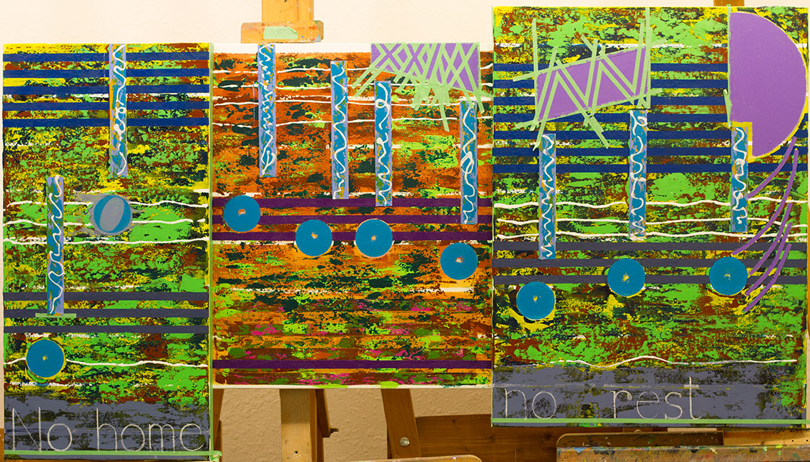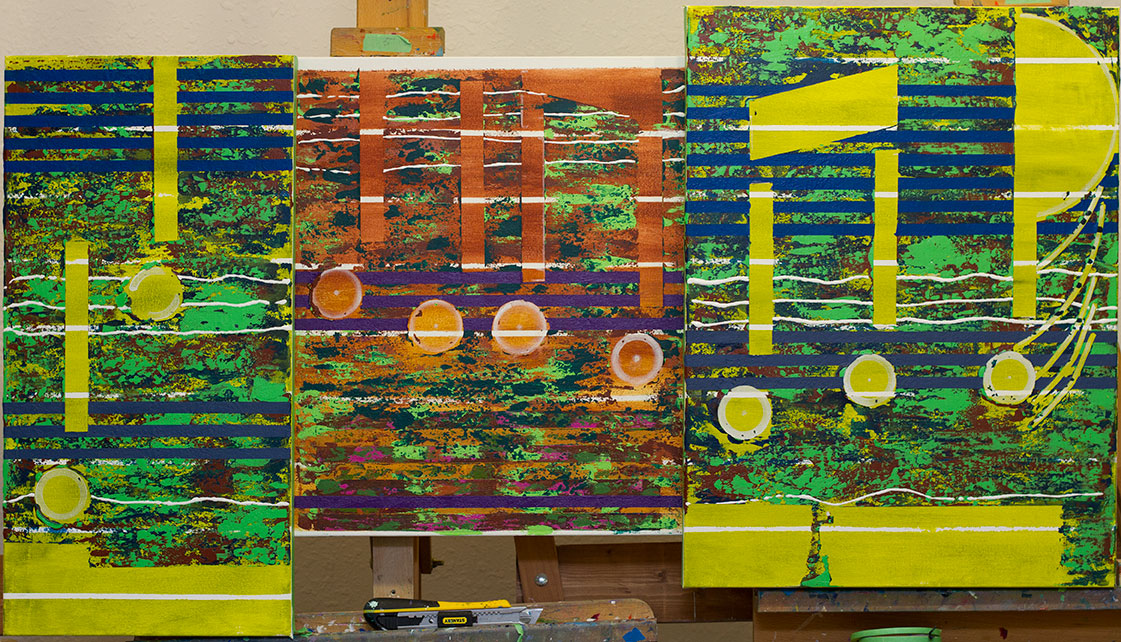 Sweet Little Angel is a music in art two canvas composition, forty inches by about twenty-eight inches in height. This is the third in this current series of small works. This artwork is a part of a larger experimental trend of putting a lot more effort in the taping and applying of the paint, to increase the drama  and aggressiveness,of the backgrounds. I no longer want backgrounds whose main purpose is to provide a decorate look to hang the music on. I am seeing in the early stages of these artworks compositions that on their own could be seen as abstract art. Still, my true goal of these advanced super charged backgrounds remains consistent with the past, to set the mood, and anchor the music in its rhythmic movement across the canvas.