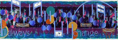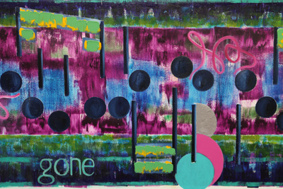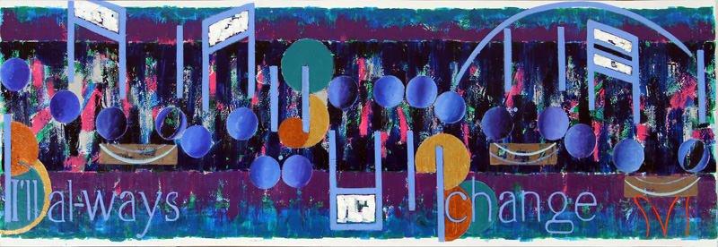 One thing missing from this work are the little solid circles inside the notes that give them motion. They just did not fit with this composition, no matter how they where drawn and colored. Overall, the canvas could have been improved with some added impact on the far upper left. Although rethinking that, the right is strong in appearance and maybe that helps to push this image across the canvas. The coloring evolved to try and push this work more in the color scheme of the thought of what the appearance of the musical group the Supremes might have been (TV back then was black and white). For example a touch of that choice of coloring is seen above in that pinkest red rest (the small circle with the slanted line).