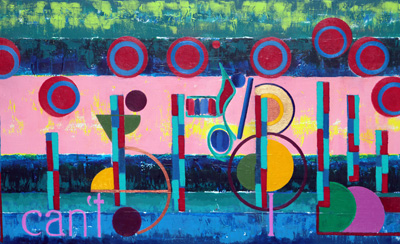 This background is very dense. Not sure that makes sense, but it does rhyme. The colors are muted, but they certainly are expressive. I had to walk over and take another look and the center, zooms across the eight plus feet of this work. These small reproductions are fair representations, but it is the size of the real artwork that needs to be seen, to clearly see what is going on with this background. This artist likes the browns, but they are not going to be a priority when this music is added. You can see in the lines, with their use of a lighter blue, the shades of violet, that there is going to be big changes to come.