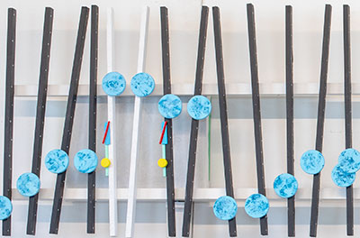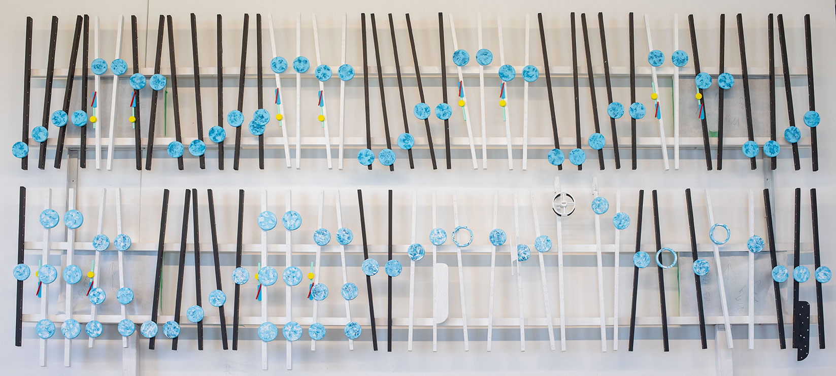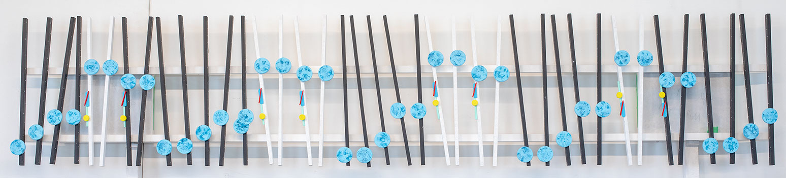For this work, I thought I would experiment with another wood frame. My thinking was that the white-painted wood frame would match the movie better than a bright metal frame. I did not see a lot of bright metal in the movie. Because of the length of eighty inches for the frame pieces, I found cutting the wood a challenge. They required a lot of sanding. One advantage of using wood frames is that the music, also made of wood, adheres strongly to the frame. This is not the case when I am using metal frames for I am gluing wood to metal. What I like about metal is its strength, straightness, and modern look.