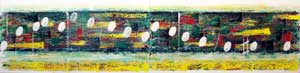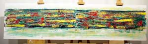 There was plenty of room to spread across my notation.   Tonight, The problem  with this background was finding a color for the notes that give them definition.  I found what will probably work in  sap green.  This shade of green was not used at all on this background.  That surprises me for I used a variety of colors searching for a combo that worked. Finally the canvas said it was OK to proceed.   Thanks for that, for I had run out of ideas.  You cannot see the notes like I do, they are all little tiny abstract painting, each an individual work of something.  I cannot stand boring routine, although each of these canvases require just that to get it done and at times it feels good to know, just what has to be completed in a session. So,with the help of a brush or a pallet knife I sculpt each note letting it tell me when just enough is enough.  You’ll see what i mean tomorrow.