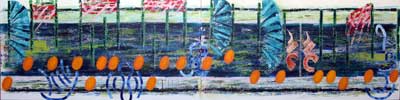 The first flow of this music is done.  It went quite well.  When I find a section of music that I want to paint I always try to push it to the two edges with as many note objects as I can fit in the canvas I have prepped.  I sometimes take a number of evenings trying to decide the note size, and their separation.  It can get frustrating at times that I just cannot fit the music in the space provided.  I rarely compromise, and in a final acceptance I give up and  look for another piece of music.  Then it is the challenge to fit everything in and mistakes have been made in the past where I miss a note object and have to wipe clean the work I had done that night.  Even when no one will ever know, I do it all because I care about the music and want to  represent it in my art the best that I can.