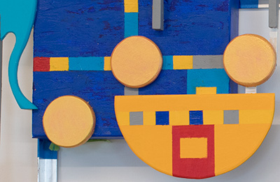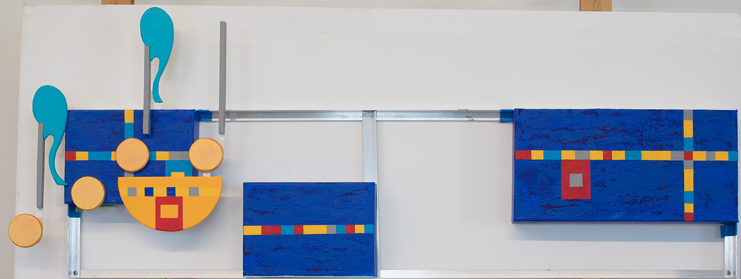 In The Mood is finished. This is an upbeat jazz music, so I used different shades of yellow, red, and multiple blues to add to the feeling of movement. For the flow of the music the first coat I painted a light magenta. I than lightly painted the music with a gold color pick from the brass instruments. I also used a light gray for the Mondrian squares, and to represent the suit color of the band on the vertical shafts.