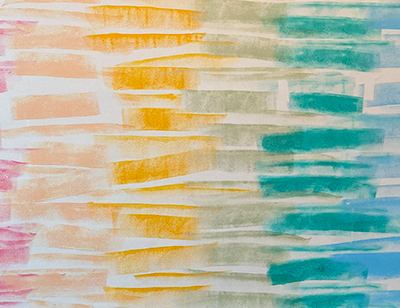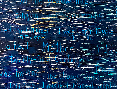 I taped a string along the top of the easel so I knew exactly where to place the top of the note’s stems. In this way, my arrangement had the correct up and down. Then excited to make sure all the notes fitted before the glue dried, I quickly attached the music, which comprised four sample sections. This well-documented concern caused me to forget to place the middle sections on different planes from the end pieces. I simply forgot to run another string. When I had finished, the top section I soon realized this error. I was beyond the time where I could safely remove any of the music without tearing away the top layer of paint. At first, I thought I would have to do the bottom layer also in one straight line, as I have done with most of my artworks over the years. This time I choose not to continue down that well-worn path. I move the bottom to two middle sections, one up and one down, and added some words along the artwork bottom to fill in as interest.