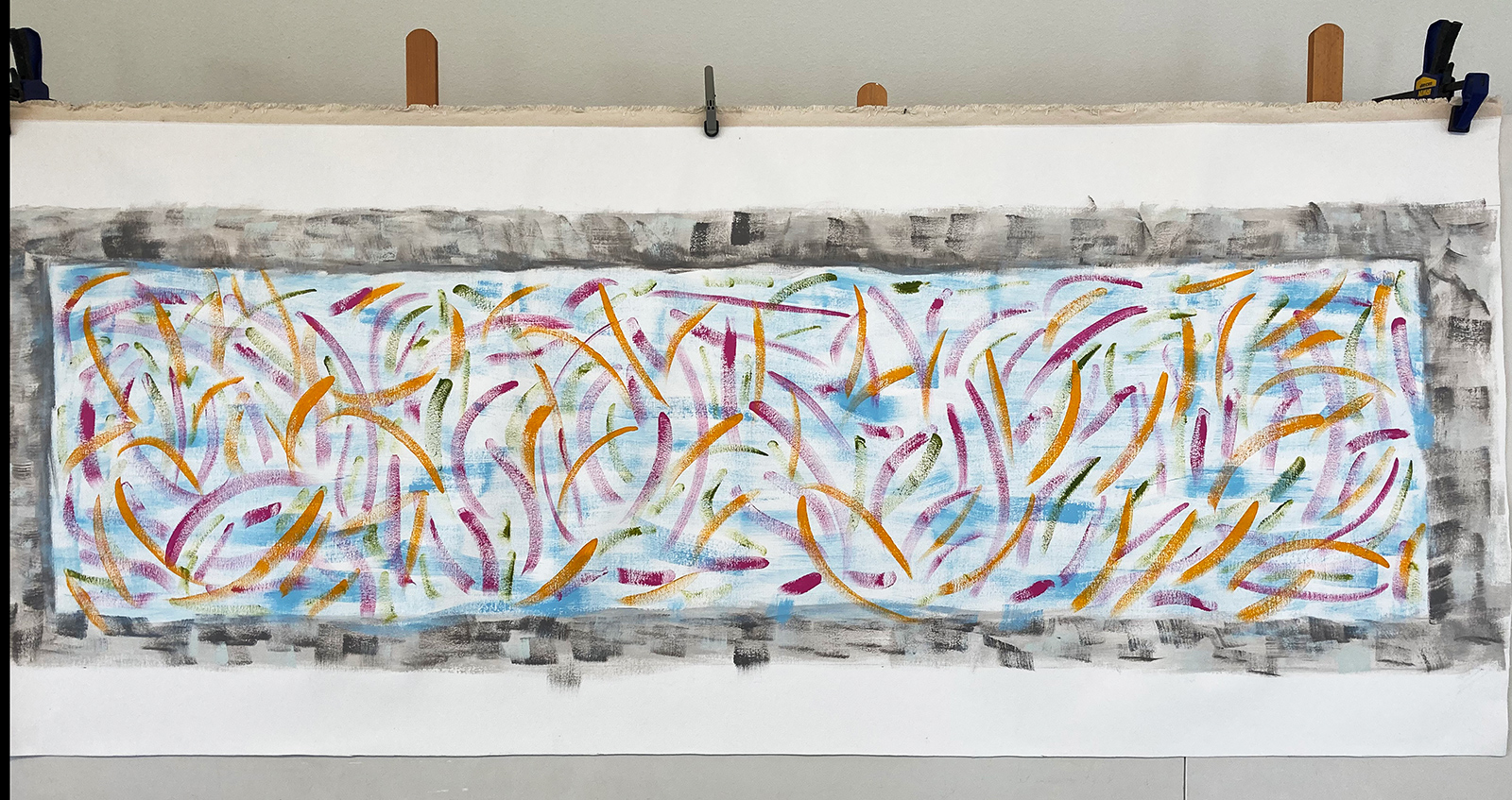 What convinced me to take on this project is that I had in storage a roll of a heavy-duty primed canvas that was large enough to create two Bach artworks to the measurements required. I told Yamakawa that my price would be $1000.00 for each artwork plus shipping. He agreed, but needed to confirm the order with the client.  It was not until early June before my next contact where the plan appeared to be changing. Their ultimate decision was to go with two prints from artworks of any Bach music.  My problem was I had no Bach artworks that came close to the style and colors that they wanted. They also needed them delivered by earlier July.  By the time I received their last request, my studio move was already in progress and set for mid-July.  I thanked him and declined their offer.   We both hoped that there will come another opportunity to work together.