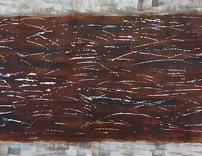 The first image shows a similarity to the artwork Where Have All the Flowers Gone.   The second image shows how I have covered up this by applying my scratch technique.  This results in me randomly scrapping away parts of the top paint layer to review the background colors (An example of this method is the artwork I Will)
