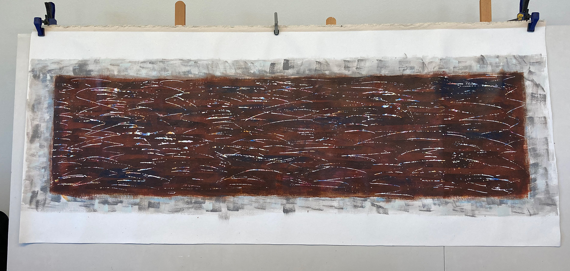 What makes this project different is that I have never tested this scratch-off technique on unstretched canvas. I originally thought this technique would only remain stable and not peel away on wood or stretched canvas. Because of that reasoning, I was not planning to use my scratch-off technique on an upstretched canvas. I changed my mind when I realized I had no other option.  My old techniques for applying paint to my backgrounds now seemed dated.   With the coming studio move, I found out that the supplies I need were already packed away.  I bought replacements for it excited me to learn how my scratch-off technique would stand up on the loose canvas.  To my surprised, it worked.  Each time I have used this technique, I am unsure how it will turn out.   It is not until I take my finger nail or a pallet knife and scrap the top layer of paint off do I believe.  To my delight on this rougher finished and heavy prime canvas the top paint layer had the right amount of adhesion that it allows me to easily scraped off the paint.  I created pencil wide back-and-forth scraps that created a look of dramatic movement across the canvas. The second image shows my results. Now, I have noticed days later I can still remove the top layer of paint, but its adherence is greater.  That is good.