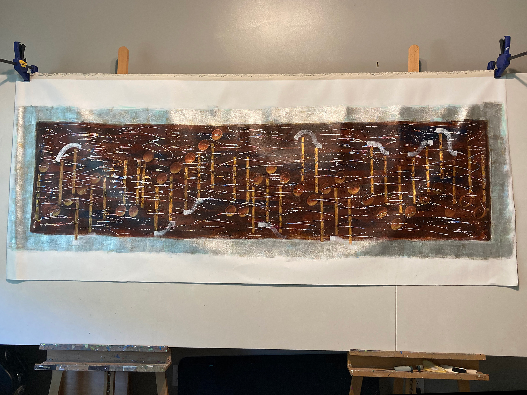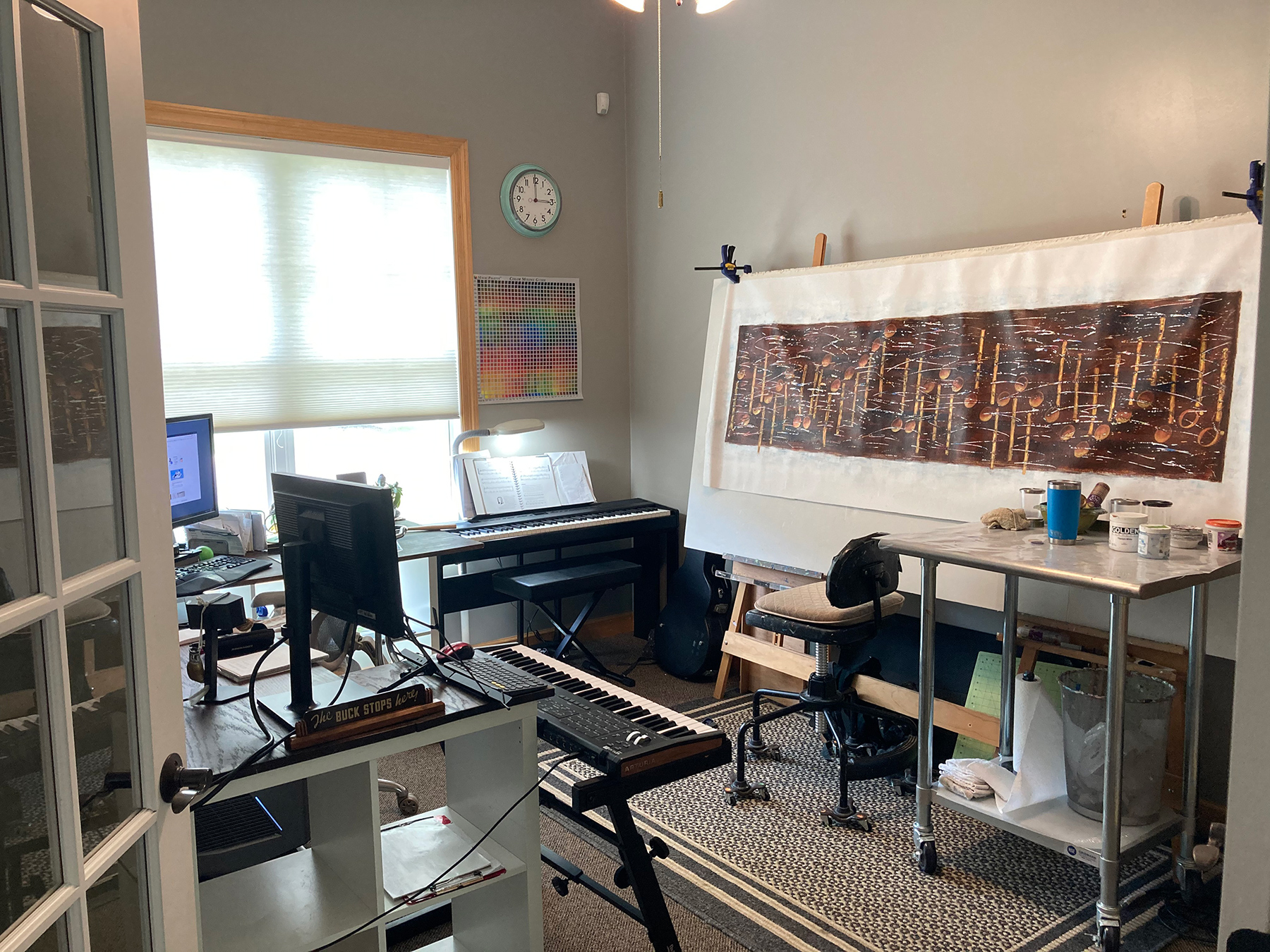 This image one shows an art that has shifted direction because my current studio is being shut down for a move to a different home, this time in the country.   This change includes the construction of a new and larger studio.  The start time for the studio construction is uncertain.  That means from now until completion I will make artworks in temporary locations, in compact spaces.   Adding to the lack of a real studio, I have become increasingly board with this art current direction and it physical and time demands which have exhausted me.   This has resulted in my sudden and required abandonment of my much favorite three-dimensional path.   For now, I will return to the world of two-dimensional primed canvas. The ability to play the music the artwork is portraying will remain. How I will add all the hardware to play and hear the music on canvas will be an interesting challenge: I will not stretch the finished artwork.  Over the past 14 plus years, I have been painting music and finding solutions for every obstacle to keep pushing this artwork style stubbornly forward.  That is the quick story.