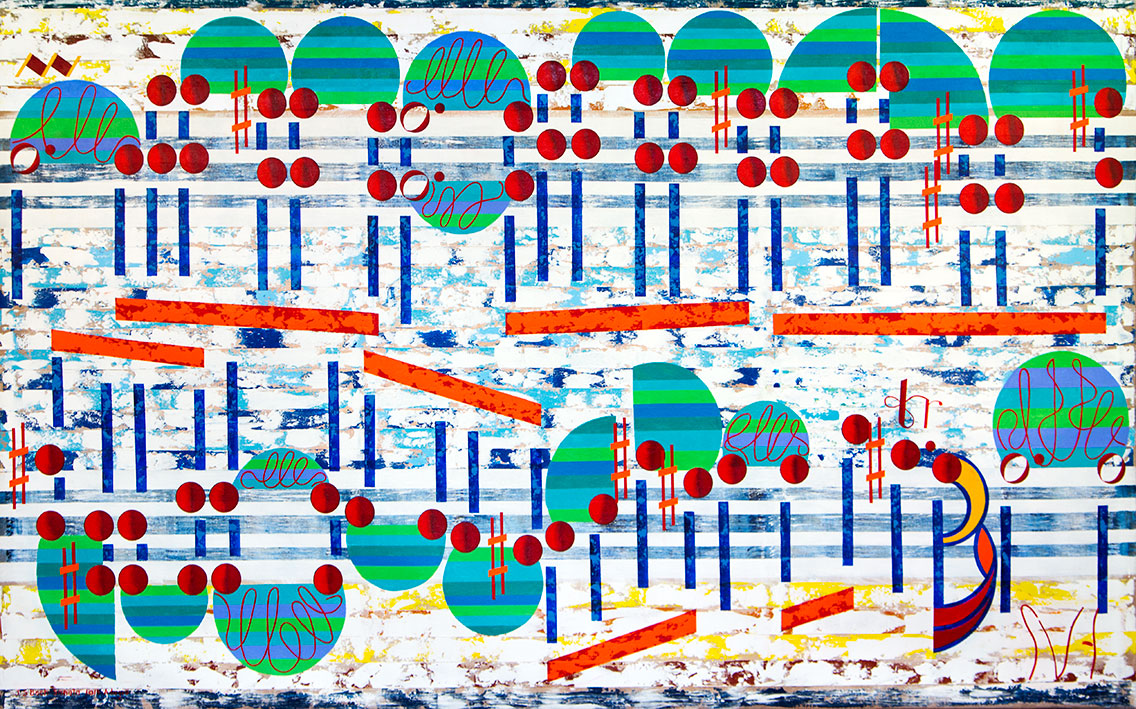Taking a look at Bach’s notation from his Chaconne manuscript, I used his hand writing style to personalize parts of the design of this artwork, and kept my color choices limited to mostly browns and grays. I added a splash of violet, to relieve color boredom, which I like doing when a few colors dominate an artwork. After photographing, I spend time cutting out this final image from its background only to discover that I had use Photoshop to paint two small parts, pale green. Finally, I spend more project time adding two other small pieces to the music that are missing from this final image. Here is a sample from the Bach manuscript: