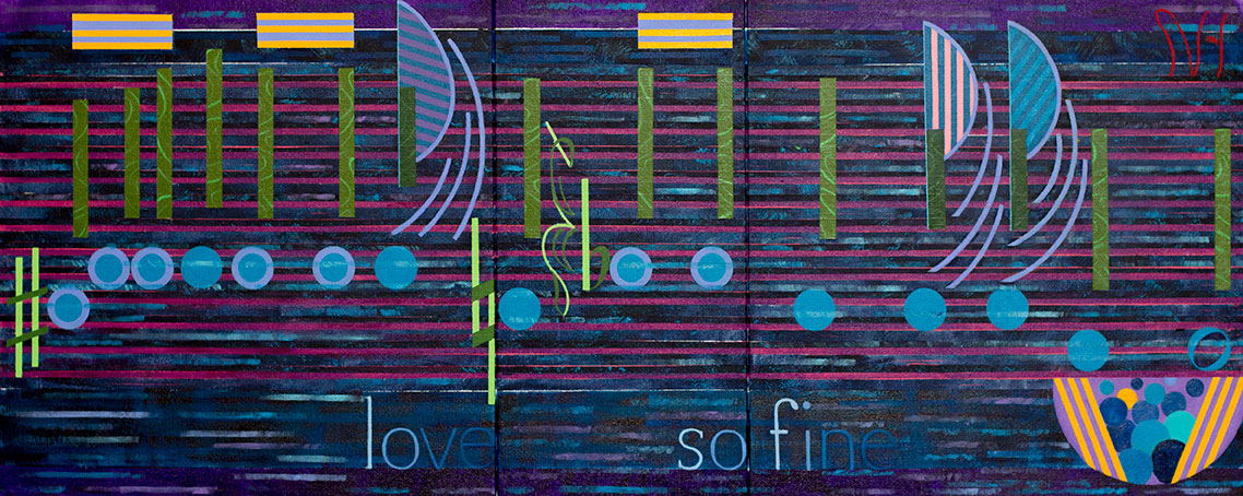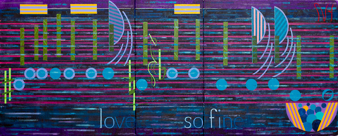 Embraceable you is finished. This painting comes from a Jazz Standard piece written by George Gershwin in 1928. This artwork consists of four canvas panels over sixty-four inches in length, and is larger than I had originally planed. What changed this artworks dimensions was my decision to add extra words, and then increase their size. To make room for the larger font I needed to use larger canvases, which then required me to enlarge the music.