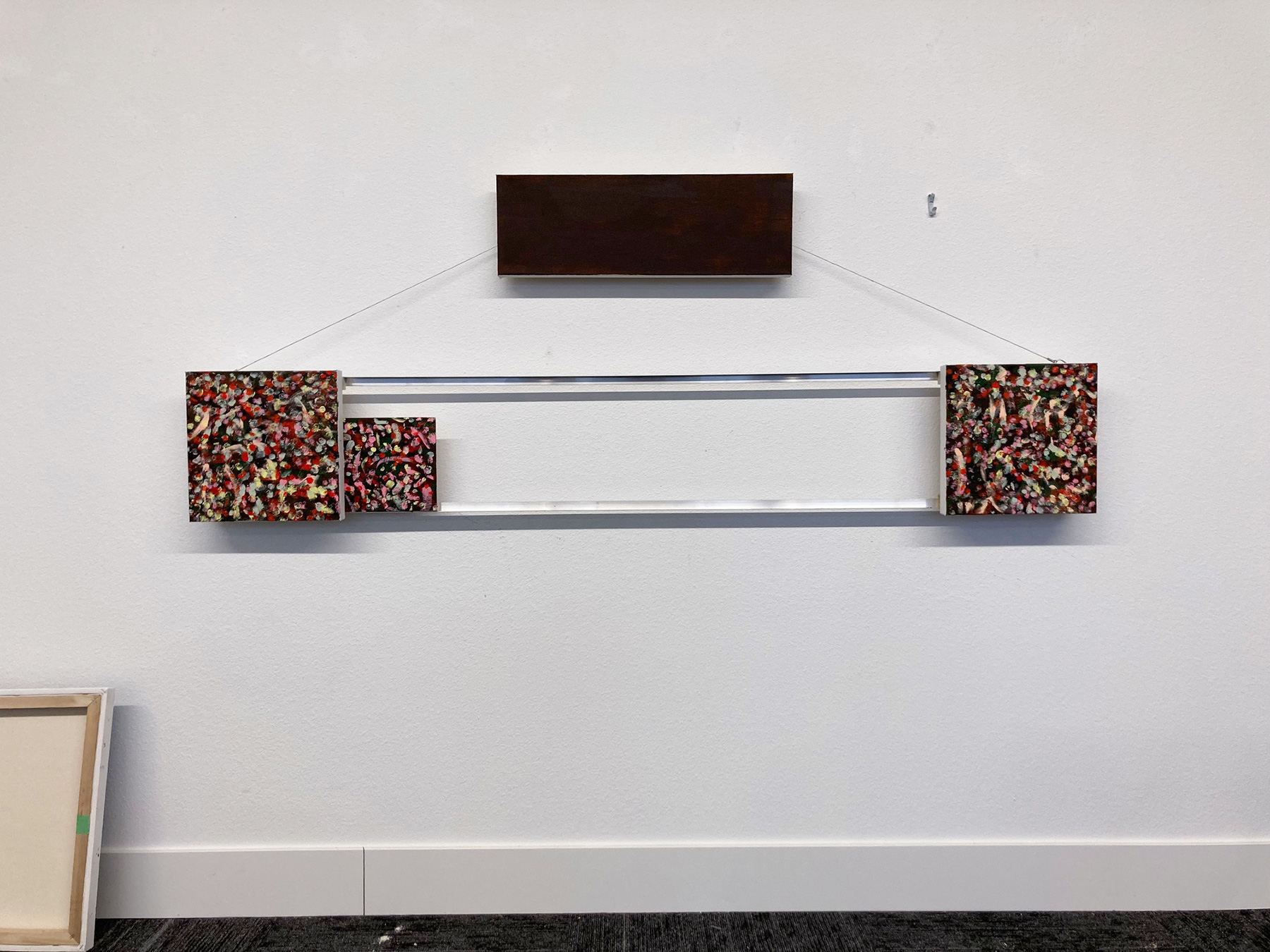My first thought for the new project was to create a nice short, even soundtrack from the four concertos, and then “sample” each season on the canvases. That is my current practice. Instead, after some thought and testing if practical, I decided against sampling the cover music. Instead, I picked 8 measures from Spring, 5 from Summer, 4 from Fall, and 5 from Winter as my cover music. I then made and found the room on six canvases to display the entire soundtrack. Looking at the current image, what I see is a 3D version of the artwork’s sheet music.