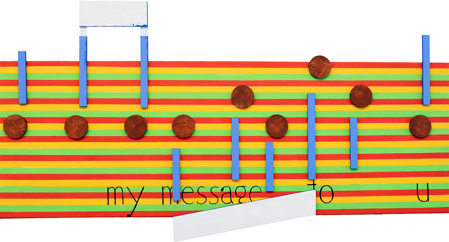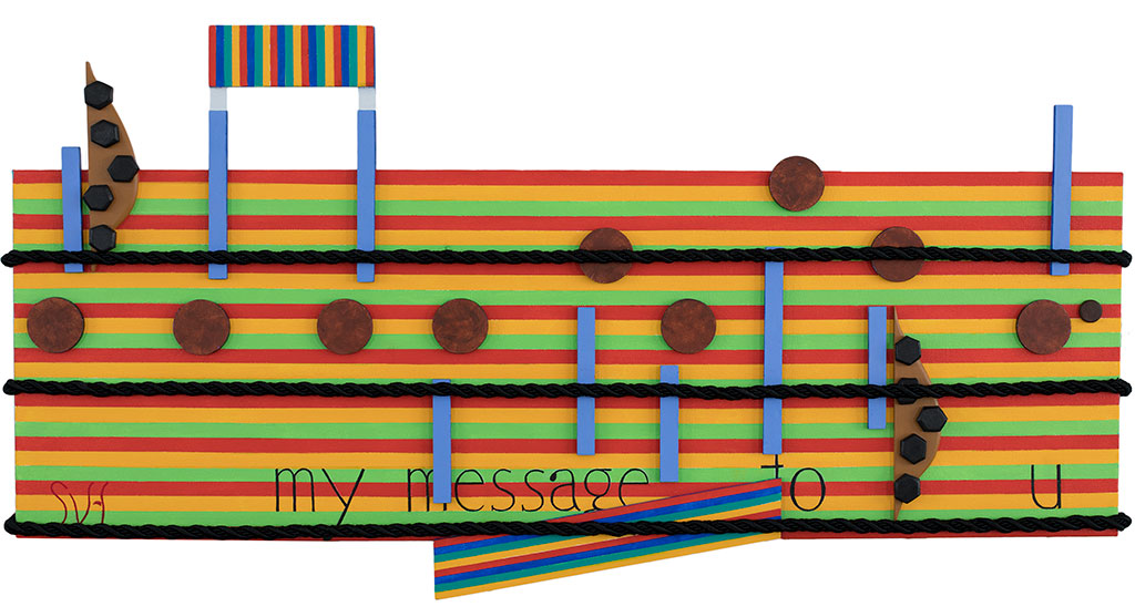 For the colors of the music I chose what I saw in Bob Marley, and his style of dress.  As for my chose of words  I believe they are one of the strengths of this painting. They open up this artwork to broad interruption and are a good ‘hook’ for the viewer, if this artwork is ever displayed in a public space.