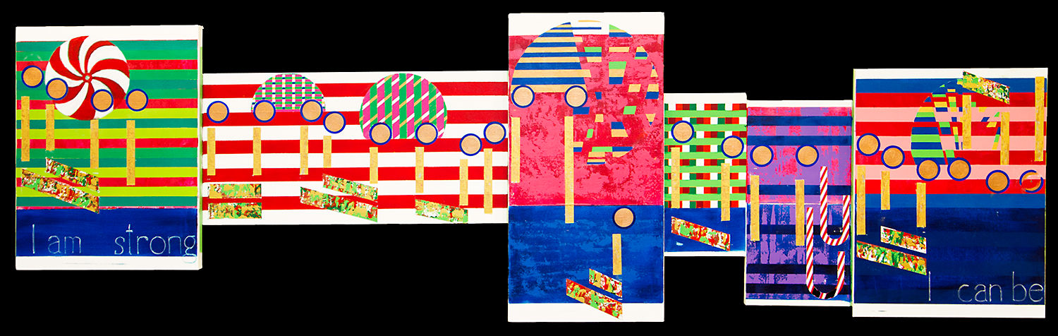 What I try to do is first to find a part of the music that would be interesting for me to portray. Usually I look for a short phrase from the music that has a sharp beginning and an end.  I may find a couple of potential pieces of the music that might work. I then look at the length and the words that are in the music. The length is important, for lately  I have trying to keep these smaller works under six feet. If I can keep the size down I then look at the words from that part of the music, and what combination I can use that when read together no longer just represents the music. In other words I choose the words carefully so that they are not apart of any particular piece of music.  My chosen words in my artworks can be found in any common conversations.  In the case of this music I choose the words “I am strong I can be.” Sure they can be found in the music, but the way I have placed them in the artwork, their meaning can be from the music, or their meaning can mean many, many other things. As always, I make it a must to separate the music from the art.