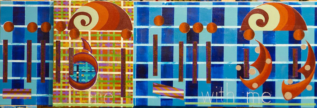 Time now to give my feedback on this work. It is cute. of course, and fits most walls. I would have liked to have used some shades of brown on the thirty-six in canvas. I decided not to going along with the work, which told me it was fine with the blues. I work the blue background, considerably, in the clean-up process, which helped. The most interesting new technique, used on this work, is the deep depth of stripping on the small panel. I have in the past been very horizontal in my stripping, and that little nine by twelve-inch panel now challenges that idea. I can see this style being pushed forward on larger works. I love the words, and I uniquely painted them using iridescent paints, which solve an issue on how to softly pop them.