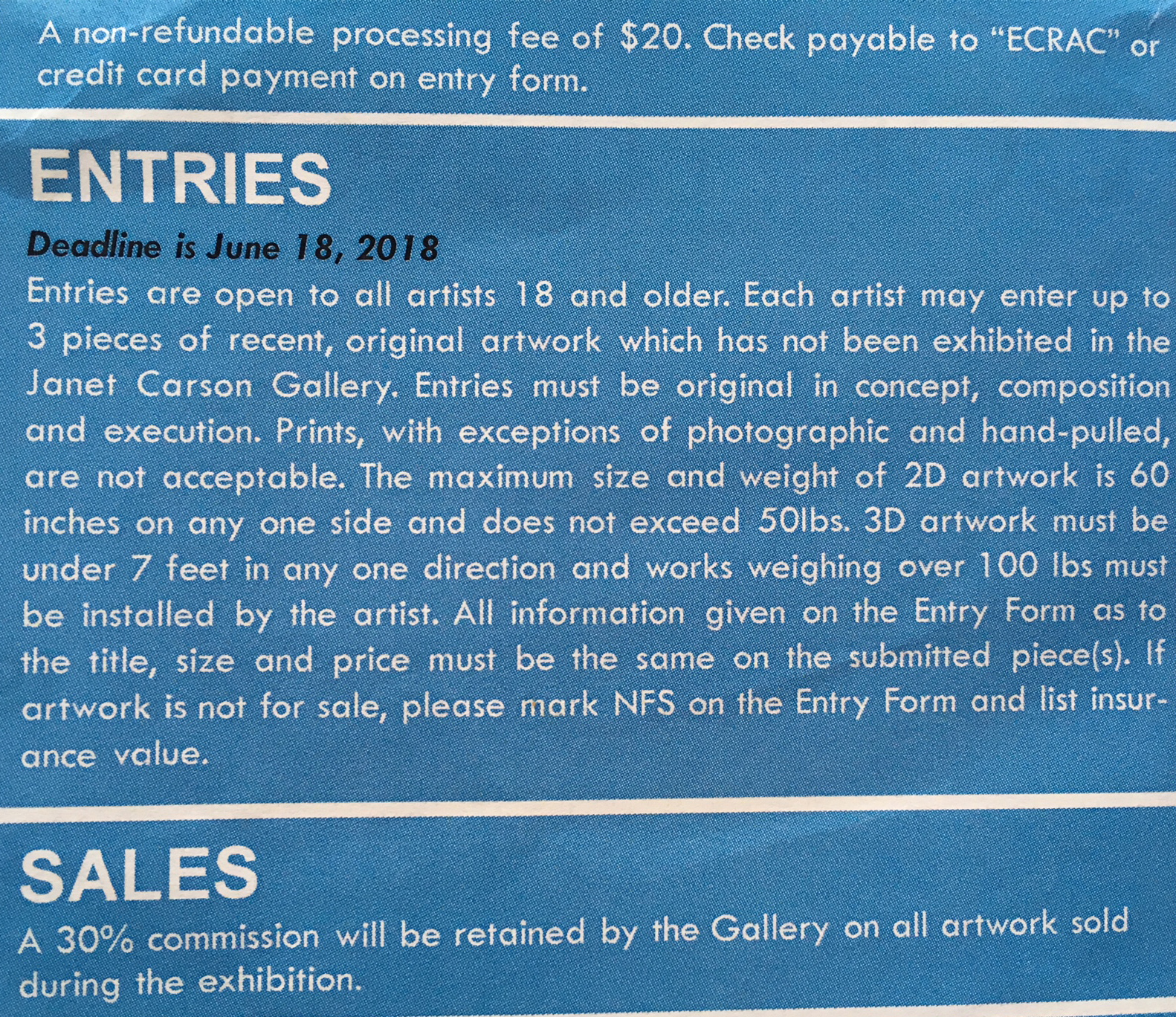 The Juror for this show is Dana Major who does “sculptural light installations and performative interactions……..,” so I find that interesting, and a small positive.  What I have figured out so far about guest art jurors is that this may limit the show promoters influence on who gets invited.  That also means that from year to year the quality and the making of the show can vary.  For this show  it is better that the Juror is from faraway Chicago, instead of locally.  The idea of a Big City Artist as the judge, may work to my benefit,  if she takes our local art seriously, and for me if she gets what this art is about.