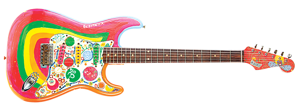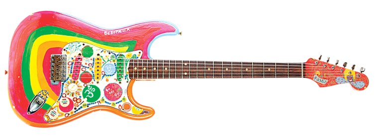 This artwork gets its inspiration from George Harrison’s Fender Stratocaster named Rocky.  Here is George talking about the guitar in this poorly lit video: