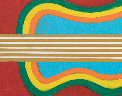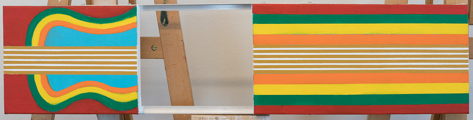At first I was going to keep the background for this artwork as simple as possible. This was to be a small quick turn-around work,  about 34 inches in length.  To keep this artwork clean-looking I painted the background around the center guitar neck image,  a solid pale green. That look worked,  but only if I was thinking of the post Beatles musician George Harrison and his album All Things Shall past.