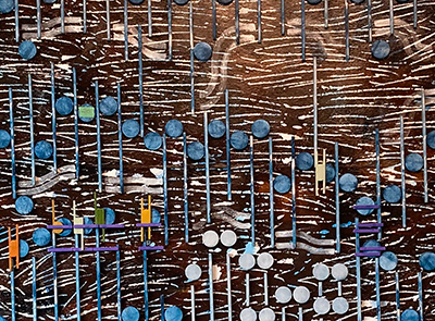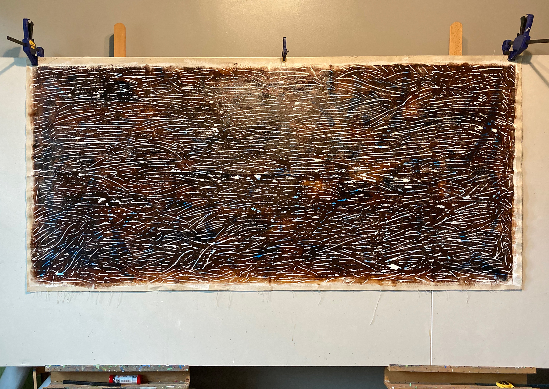 Photo 7: The original canvas, painted with no support and covered with music glued to its surface, was vulnerable to movement. Any twisting would meet resistance from the stiffer wooden pieces glued to its surface. The resulting strain would cause the separating of the top layer of paint from the canvas that also held the wooded pieces. This occurred for the top painted layer was applied using my experimental scratch off technique. This technique allows me to scrap off a layer of paint to reveal the base colors underneath. Anything attached to such a layer, which was the wooden music, could also as easily lose its support with even minor twisting. To save and allow this music box to be displayable, I had to come up with a way to support the loose canvas from movement when being handled.