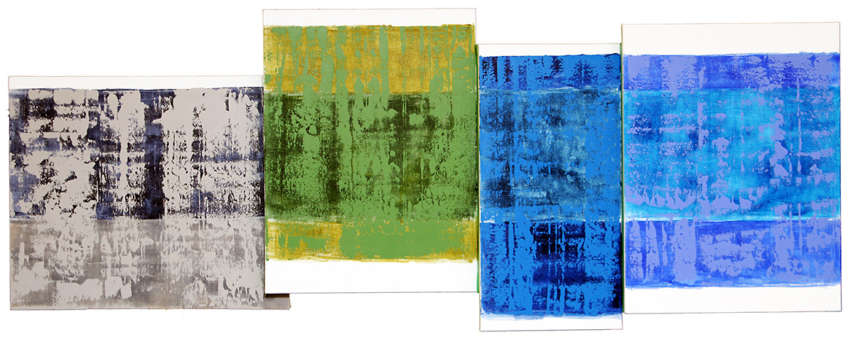 The base colors are dark and gritty, to keep with the mood of the music. This changes as the work moves from left to right. The third canvas elevates about the first two, while the fourth canvas is another step up from the third  This artwork is another three-layered work, similar to The Four Seasons Work, Spring Danza, where you have to go to the firth canvas which is the first to touch the wall in my living room.